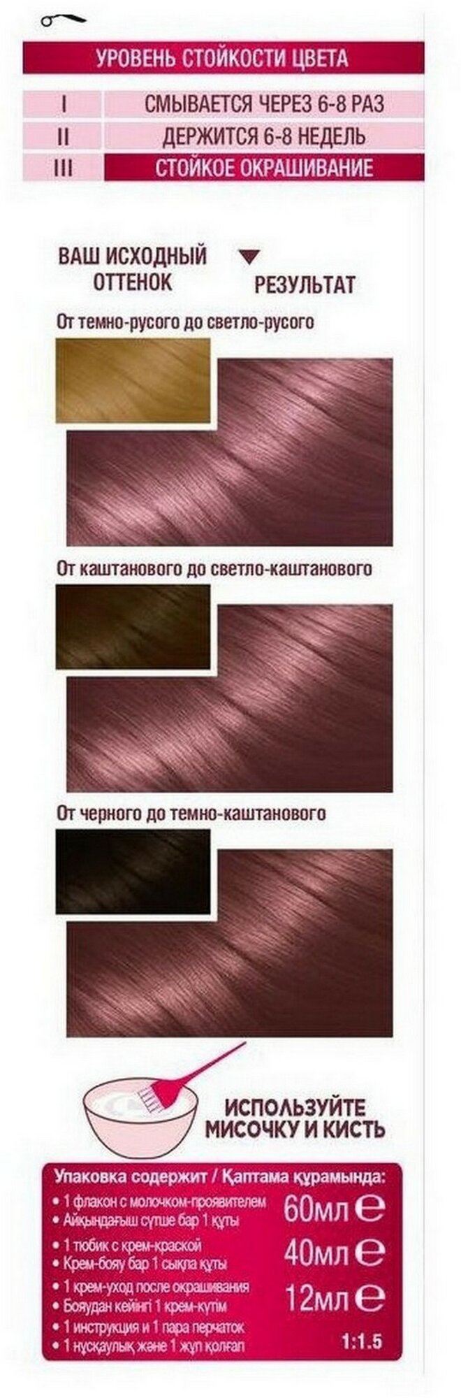 | Способ применения | мешайте крем-краску и молочко-проявитель. Нанесите на волосы. Подождите рекомендованное на упаковке время и смойте. Нанесите бальзам. Смойте. Для усиления защиты цвета от вымывания используйте шампунь для окрашенных волос |