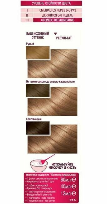 | Способ применения | мешайте крем-краску и молочко-проявитель. Нанесите на волосы. Подождите рекомендованное на упаковке время и смойте. Нанесите бальзам. Смойте. Для усиления защиты цвета от вымывания используйте шампунь для окрашенных волос |