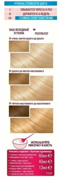 | Комплектация | - флакон с молочком-проявителем (60 мл); - тюбик с обесцвечивающим кремом (40 мл); - крем-уход после окрашивания (10 мл); - инструкция; - пара перчаток |