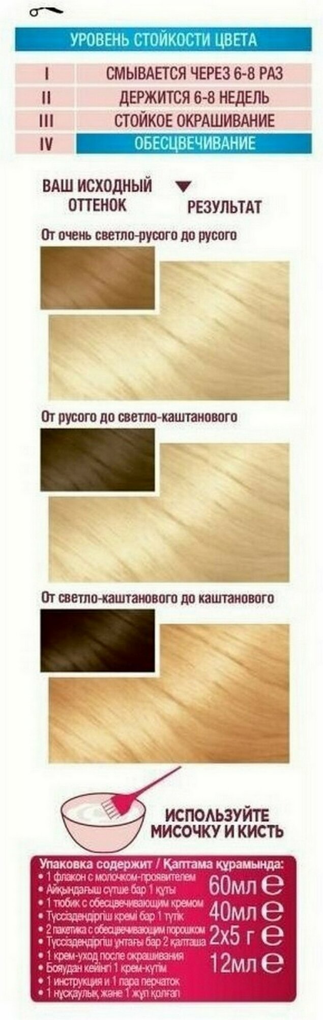 | Комплектация | - флакон с молочком-проявителем (60 мл); - тюбик с обесцвечивающим кремом (40 мл); - крем-уход после окрашивания (10 мл); - инструкция; - пара перчаток |