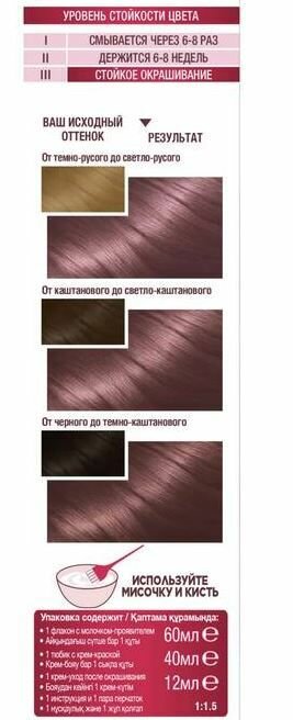 | Способ применения | мешайте крем-краску и молочко-проявитель. Нанесите на волосы. Подождите рекомендованное на упаковке время и смойте. Нанесите бальзам. Смойте. Для усиления защиты цвета от вымывания используйте шампунь для окрашенных волос |