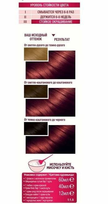 | Способ применения | мешайте крем-краску и молочко-проявитель. Нанесите на волосы. Подождите рекомендованное на упаковке время и смойте. Нанесите бальзам. Смойте. Для усиления защиты цвета от вымывания используйте шампунь для окрашенных волос |