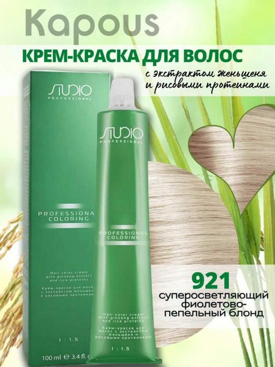 Kapous Studio Professional Крем-краска для волос Studio, тон №9.21, Очень светлый фиолетово-пепельный бло с рисовыми протеинами и экстрактом женьшеня,