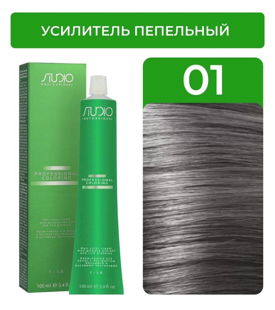 Kapous Studio Professional Крем-краска для волос Studio, усилитель цвета, с рисовыми протеинами и экстрактом женьшеня, тон №01, Пепельный, 100 мл
