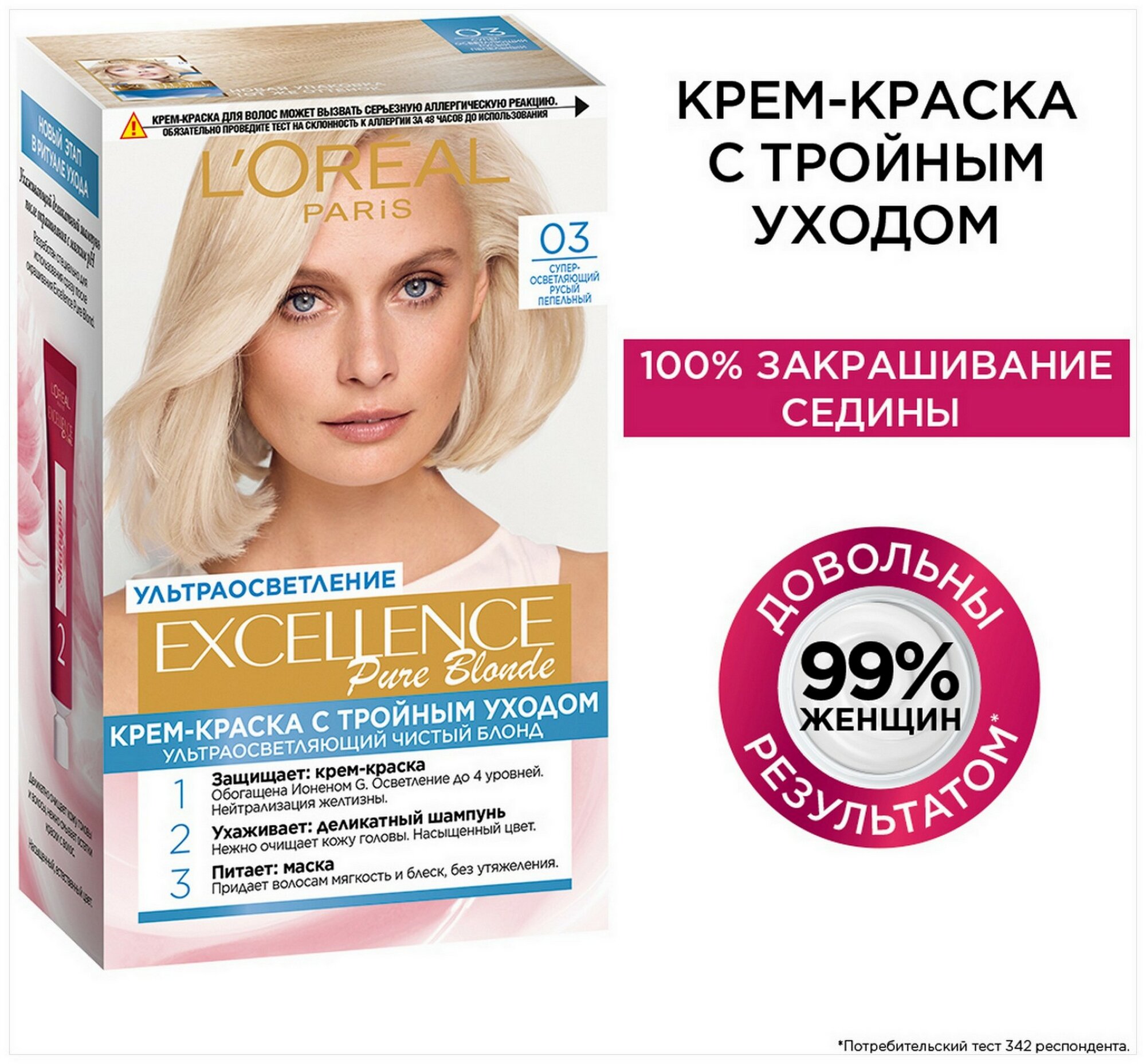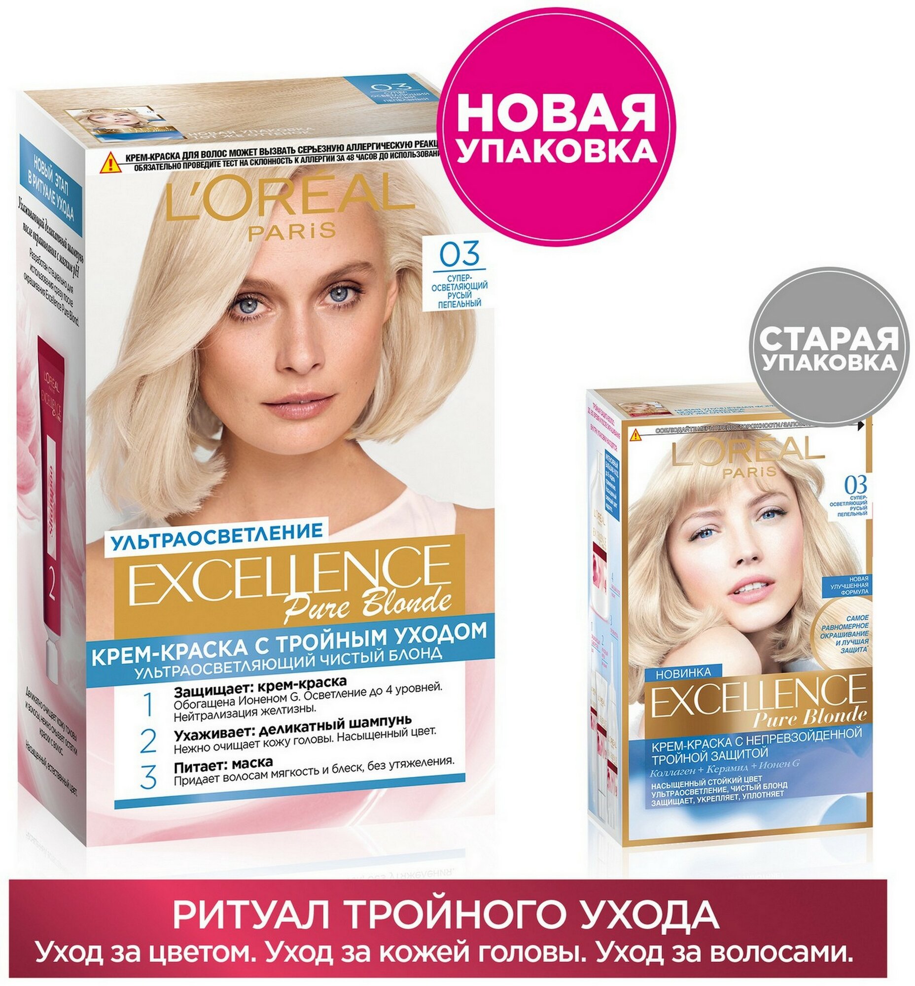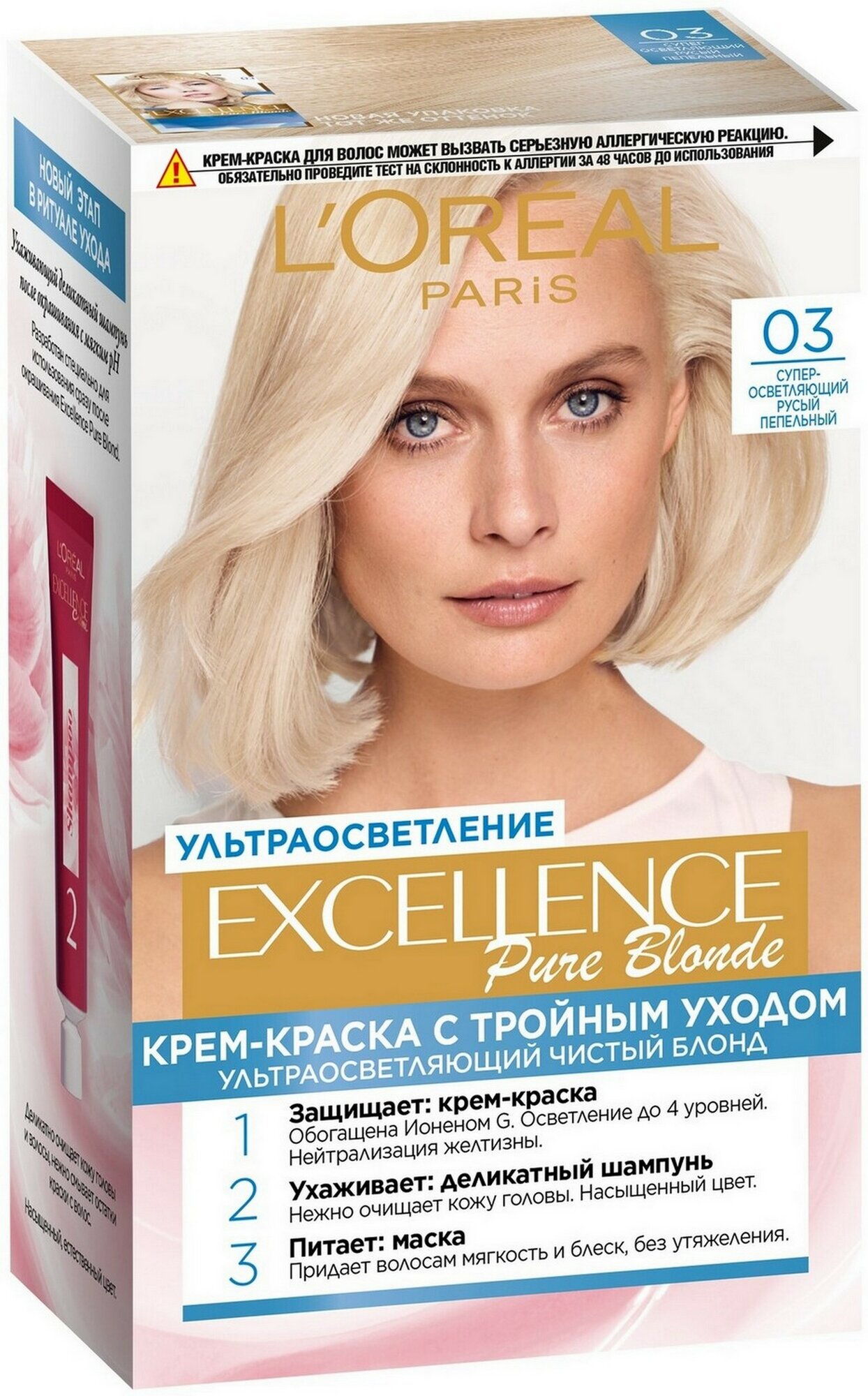 L Oreal Paris Стойкая крем-краска для волос, Excellence, тон 03, Суперосветляющий русый, пепельный, 2 шт.