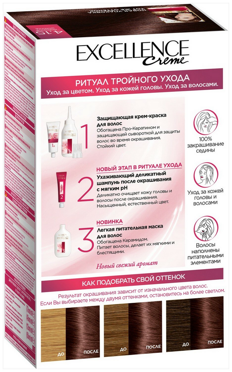 Ниже Вы можете прочитать отзывы на L'Oreal Paris Excellence стойкая крем-краска для волос, 4.15 Морозный шоколад - 6 шт, ознакомится с подробными характеристиками, посмотреть интересные обзоры и фотографии на L'Oreal Paris Excellence стойкая крем-краска для волос, 4.15 Морозный шоколад - 6 шт.