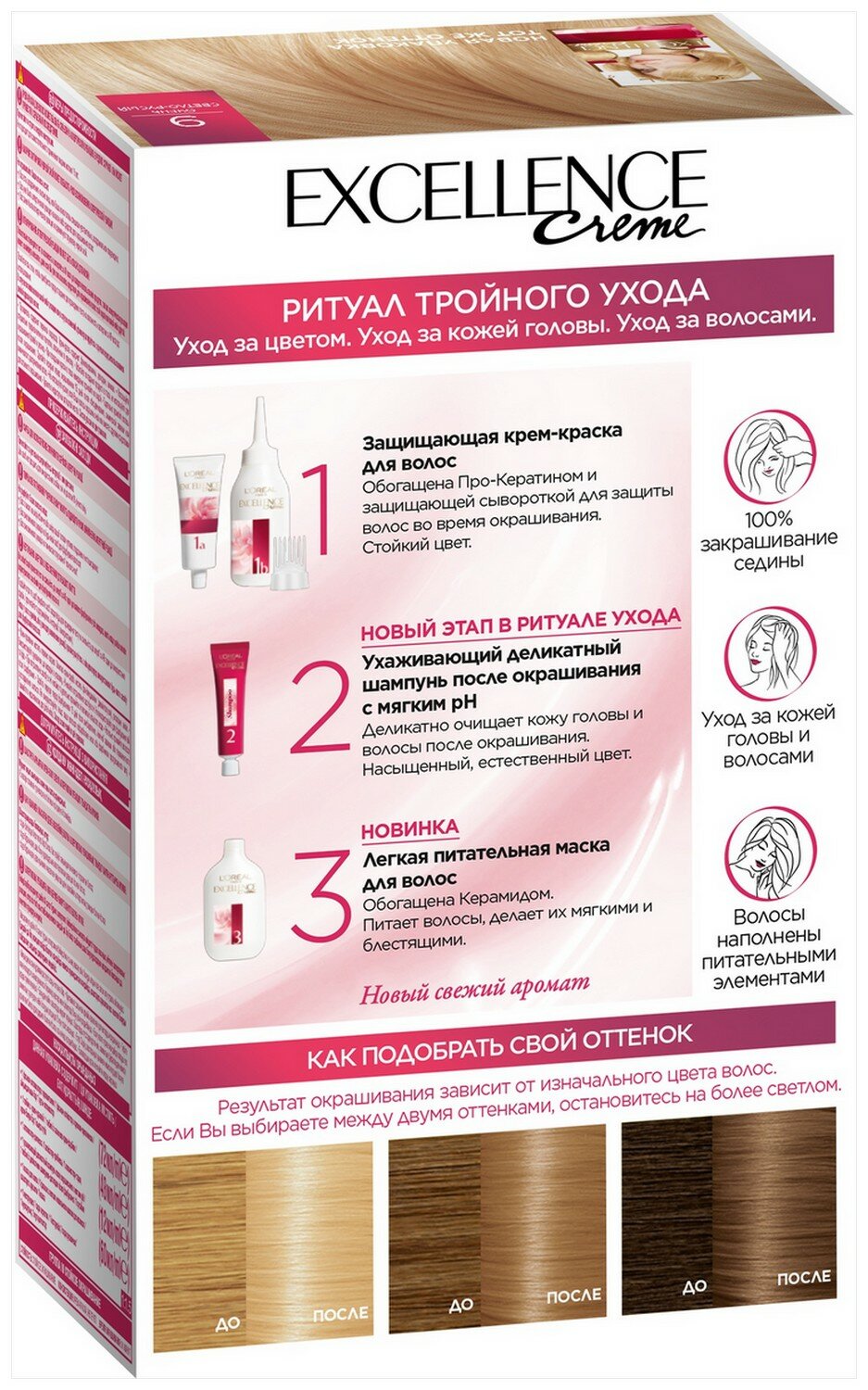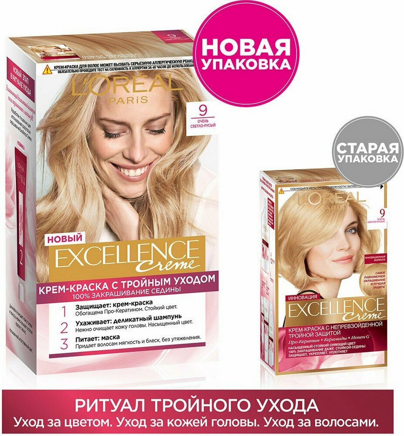 Ниже Вы можете прочитать отзывы на L'Oreal Paris Excellence стойкая крем-краска для волос, 9 очень светло-русый - 6 шт, ознакомится с подробными характеристиками, посмотреть интересные обзоры и фотографии на L'Oreal Paris Excellence стойкая крем-краска для волос, 9 очень светло-русый - 6 шт.