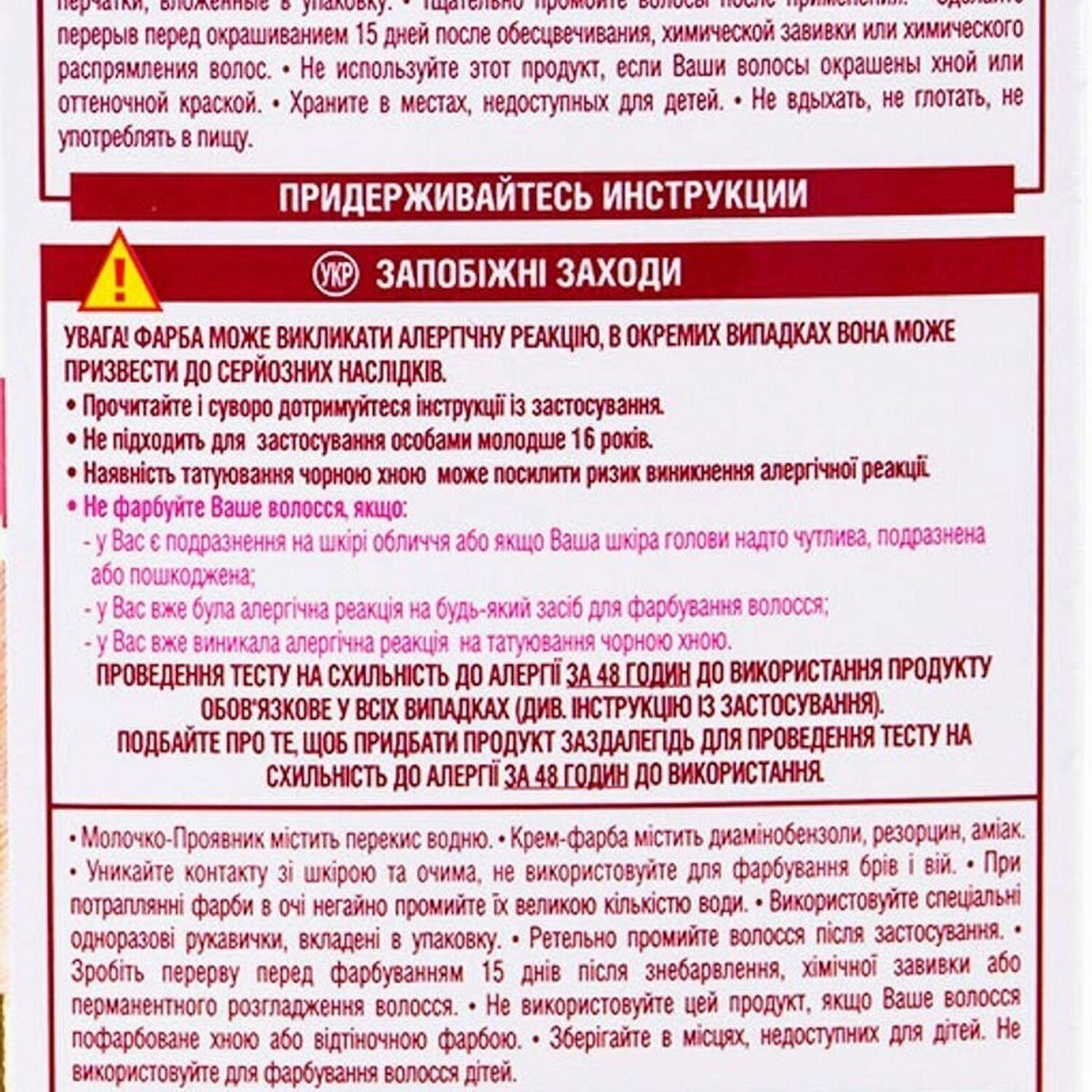 | Способ применения | перед началом окрашивания необходимо снять украшения и нанести крем по контуру лица, чтобы защитить кожу от попадания краски. Перед применением следует пройти тест на аллергическую реакцию. Внимательно прочтите инструкцию, следуйте ее рекомендациям |