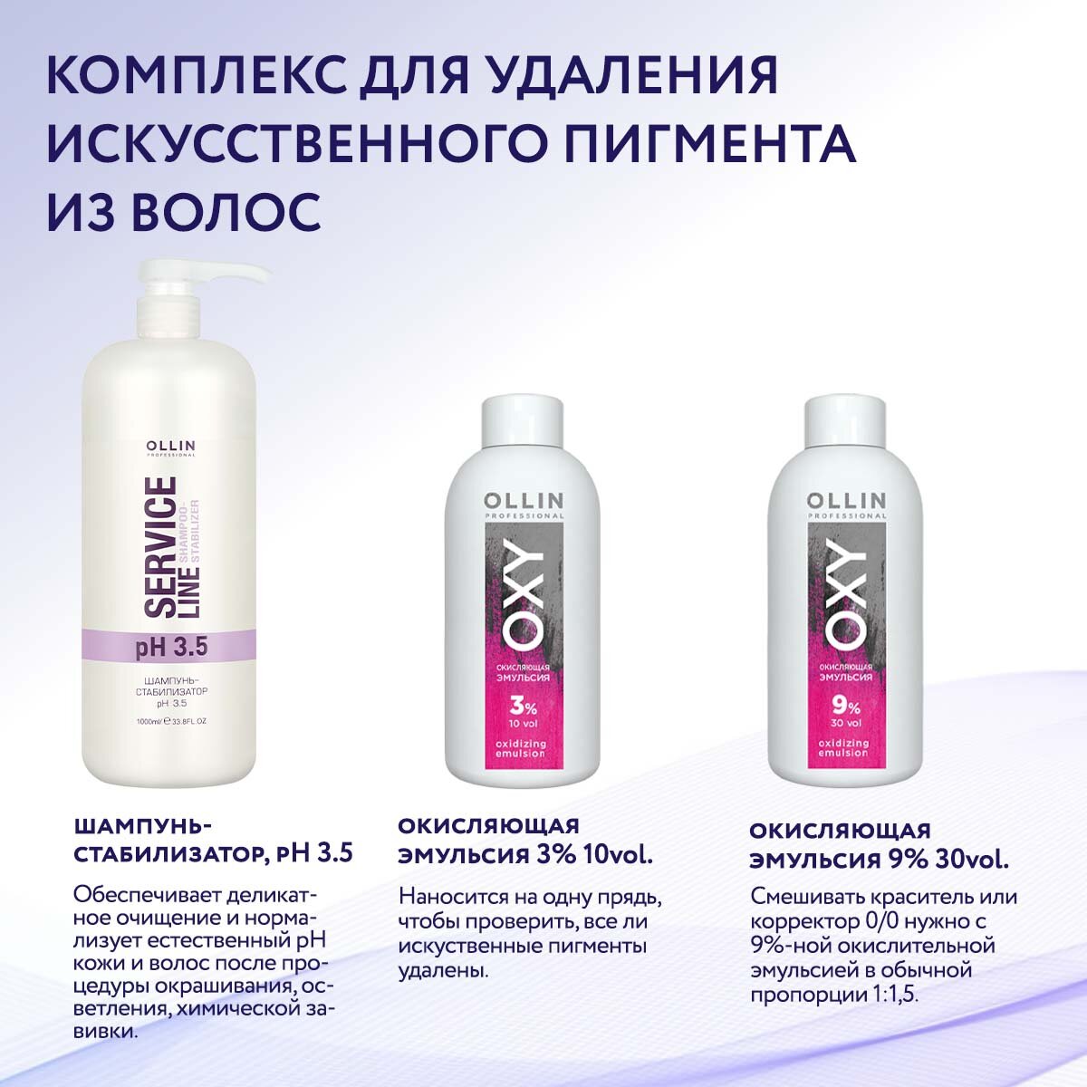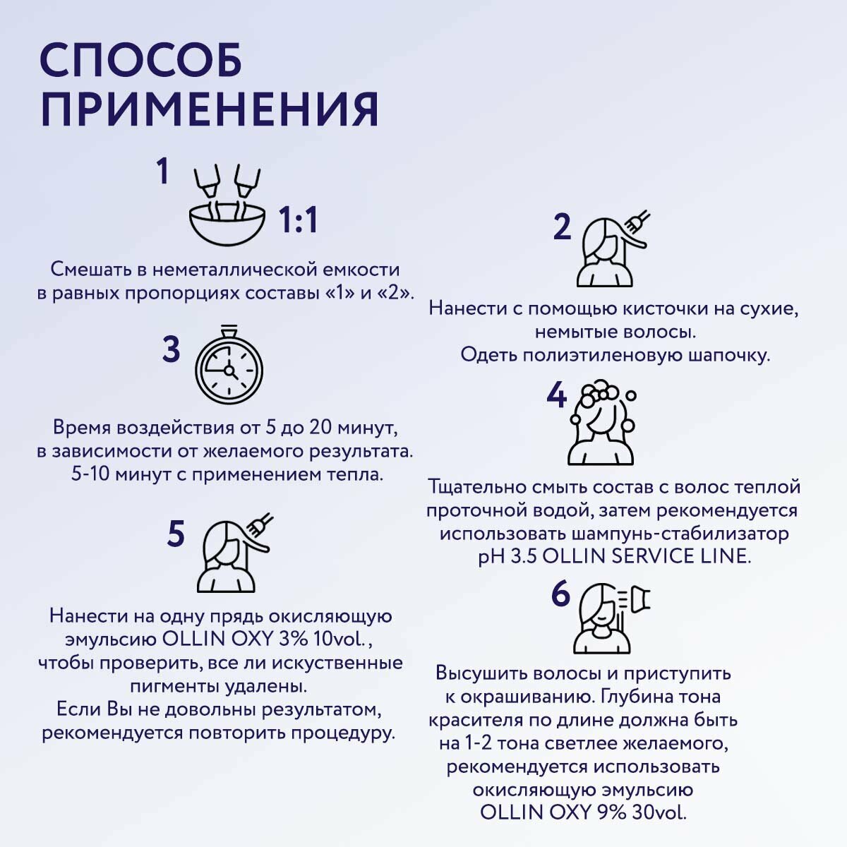| Способ применения | смешать в равных пропорциях составы 1 и 2 строго на весах. Нанести на волосы. Время воздействия — 15–20 минут (10 минут — при использовании дополнительного тепла). Тщательно смыть, используя шампунь-пилинг pH 7,0. Нанести на одну прядь проявитель-фактор 10 vol. (3%), чтобы проверить, удалены ли все искусственные пигменты. Если цвет проявился снова, повторить нанесение составов 1 и 2 на вымытые и подсушенные волосы. Рекомендованное количество смывок за день — 1–2. Если результат устраивает, смыть с волос проявитель. Высушить волосы. Приступить к окрашиванию. Глубина тона выбранного красителя по длине волос должна быть на 1–2 тона светлее желаемого с использованием окисляющей эмульсии 30 vol. (9%) |