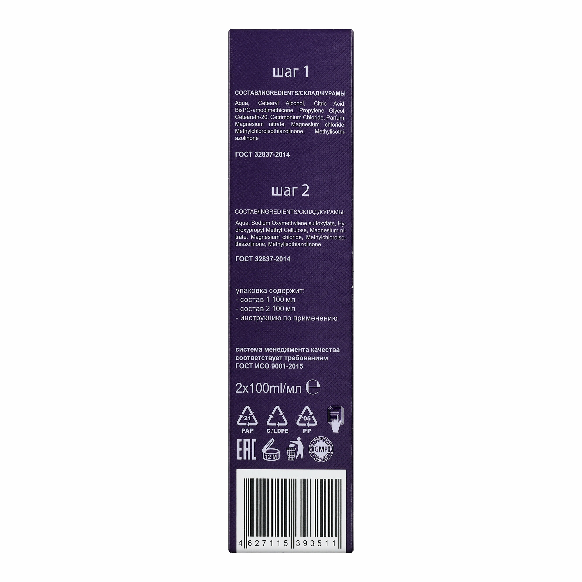 | Состав | шаг 1: aqua, cetearyl alcohol, citric acid, bis(c13-15alkoxy) pg amodimethicone, propylene glycol, ceteareth-20, cetrimonium chloride, parfum, magnesium nitrate, magnesium chloride, methylchloroisothiazolinone, methylisothiazolinone. шаг 2: aqua, sodium oxymethylene sulfoxylate, hydroxypropyl methyl cellulose, magnesium nitrate, magnesium chloride, methylchloroisothiazolinone, methylisothiazolinone |