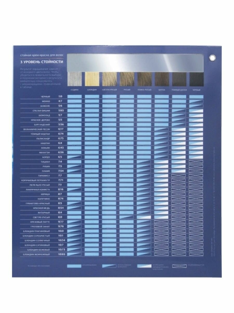 | Дополнительная информация | тест на чувствительности: приготовьте смесь из небольшого количества крем-основы и такого же объёма оксигента, перемешав их в любой неметаллической посуде. Не следует готовить весь объем краски. Нанесите приготовленную смесь на небольшой участок кожи на внутренней стороне локтевого сгиба или за ухом и оставьте на 10-15 минут. Затем смойте. Если в течение суток признаки аллергической реакции не появились, можете использовать краску |