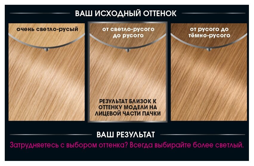| Способ применения | Смешайте крем-краску и молочко-проявитель. Нанесите на волосы. Подождите рекомендованное на упаковке время и смойте. Нанесите бальзам. Смойте. Для усиления защиты цвета от вымывания используйте шампунь для окрашенных волос |