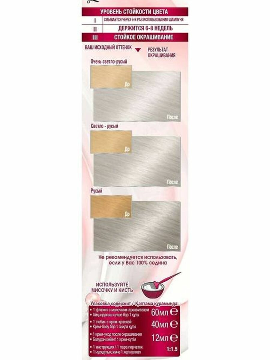 | Комплектация | флакон с молочком-проявителем 50 мл, тюбик с крем-краской 50 мл, крем-уход после окрашивания 12 мл, инструкция, пара перчаток |
