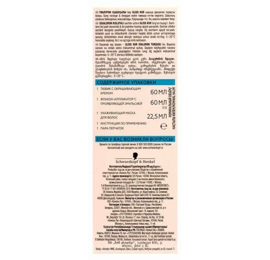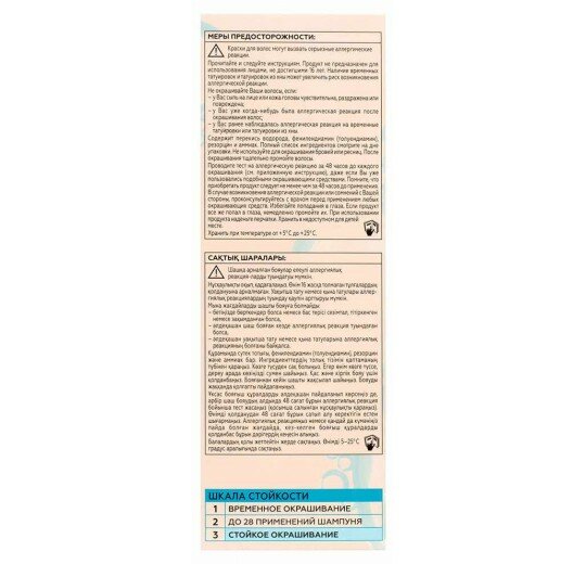 | Дополнительная информация | тюбик с окрашивающим кремом - 60 мл, флакон-аппликатор с проявляющей эмульсией - 60 мл, ухаживающая маска для волос - 22,5 мл |