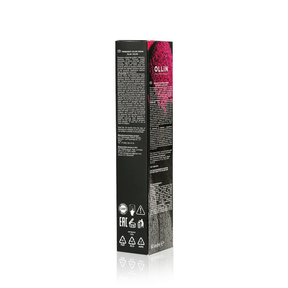 | Способ применения | смешать в неметаллической мисочке краску Ollin Color 60 мл с окисляющей эмульсией Ollin Oxy 90 мл: для оттенков основной палитры с 1/хх по 10/хх ряд - в пропорции 1:1,5 (краситель 60 мл + окислитель 90 мл); для специальных блондинов 11/хх - в пропорции 1:2 (краситель 60 мл + окислитель 120 мл) |
