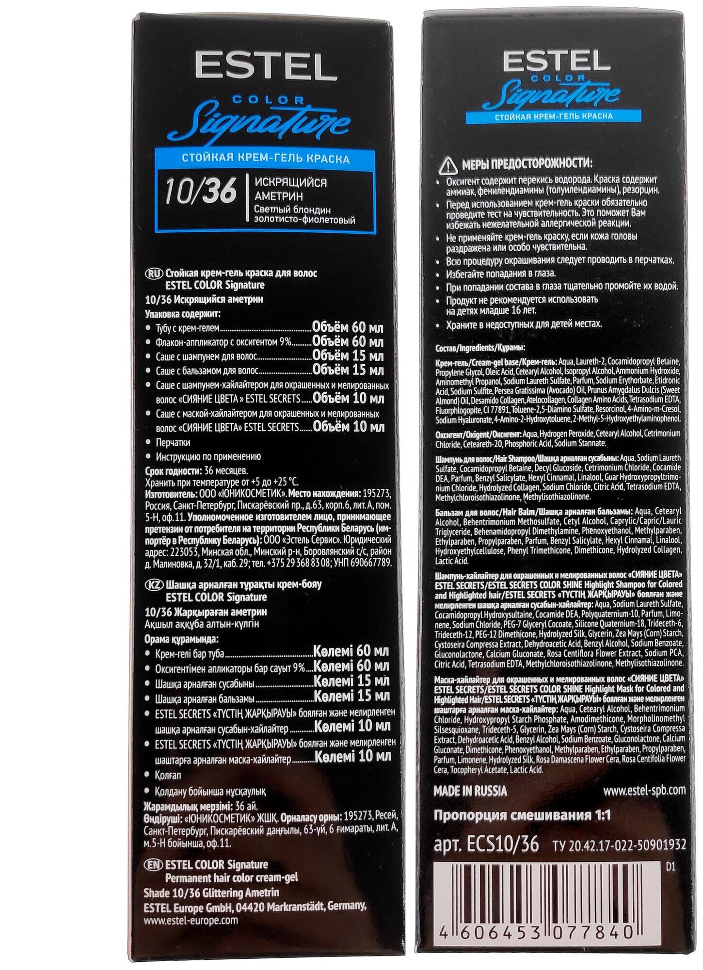 Ниже Вы можете прочитать отзывы на ESTEL COLOR Signature Стойкая крем-гель краска для волос, 10/36 Искрящийся аметрин, ознакомится с подробными характеристиками, посмотреть интересные обзоры и фотографии на ESTEL COLOR Signature Стойкая крем-гель краска для волос, 10/36 Искрящийся аметрин.