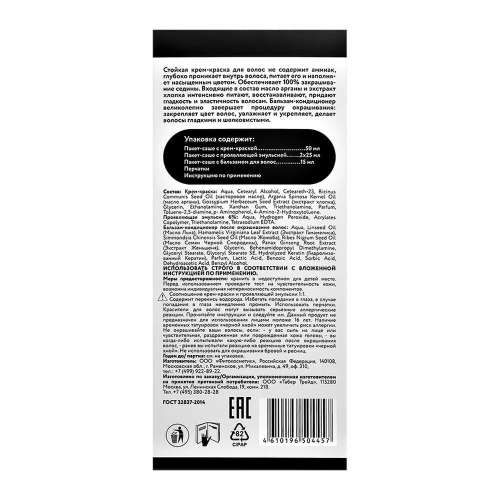 | Комплектация | Крем-краска, проявляющая эмульсия 9%, бальзам-кондиционер, перчатки |