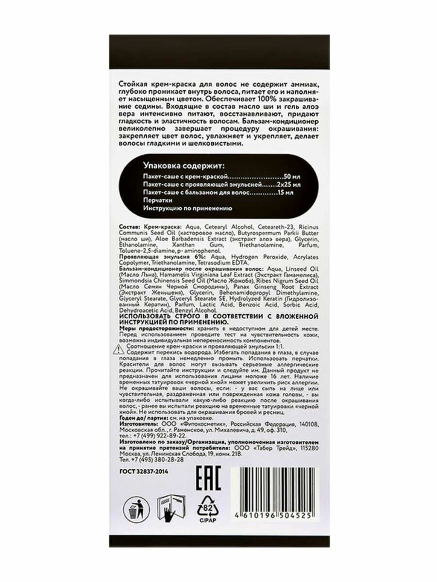 | Комплектация | Крем-краска, проявляющая эмульсия 9%, бальзам-кондиционер, перчатки |