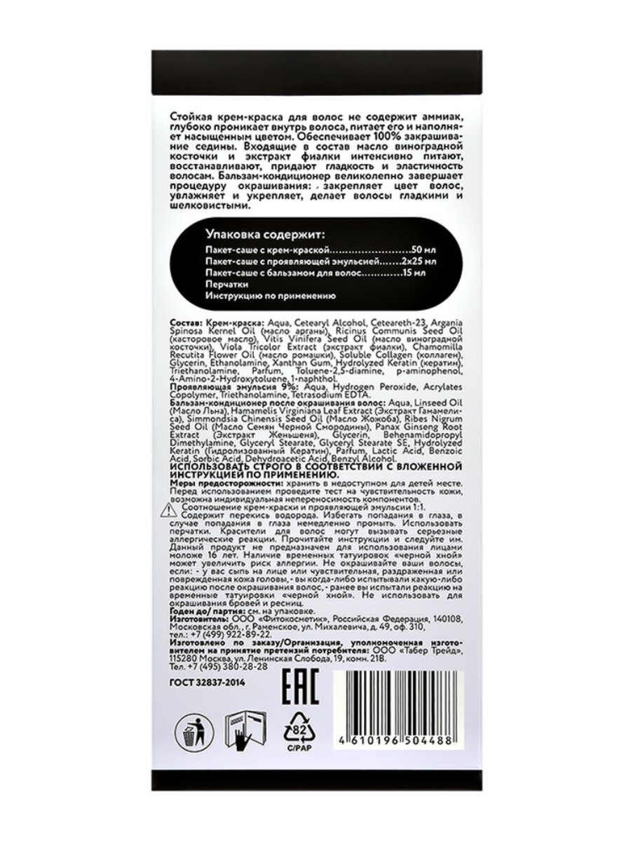 | Комплектация | Крем-краска, проявляющая эмульсия 9%, бальзам-кондиционер, перчатки |