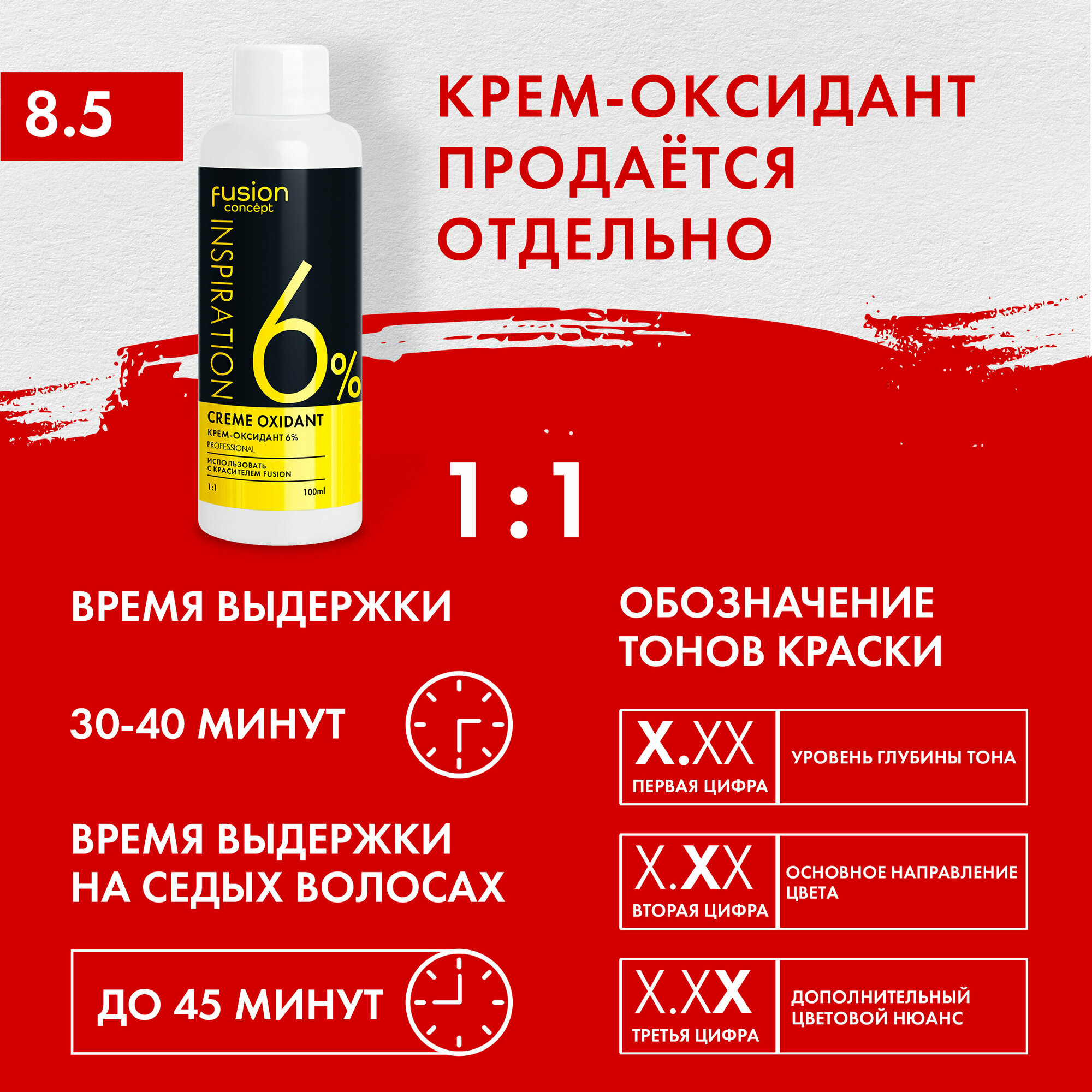 | Способ применения | Внимательно ознакомьтесь с инструкцией, прежде, чем использовать крем-краску Concept Fusion. При выборе тона крем-краски принимайте во внимание интенсивность, способность к закрашиванию седины и осветляющее действие состава. Проведите тест на чувствительность кожи. Смешайте крем-краску Concept Fusion и оксидант в пропорции 1:1. Окрашивающую смесь смешайте непосредственно перед нанесением на волосы. Выдержите окрашивающую смесь на волосах в течение рекомендованного времени. Смойте окрашивающую смесь шампунем. Рекомендуем воспользоваться 4-х ступенчатой системой ухода Super Miracle от Concept Fusion. |