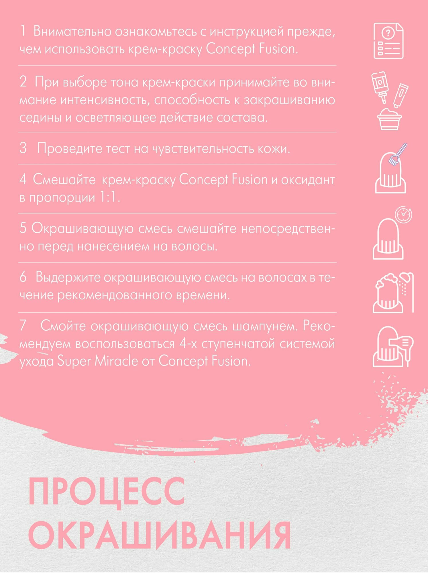 | Способ применения | Внимательно ознакомьтесь с инструкцией, прежде, чем использовать крем-краску Concept Fusion. При выборе тона крем-краски принимайте во внимание интенсивность, способность к закрашиванию седины и осветляющее действие состава. Проведите тест на чувствительность кожи. Смешайте крем-краску Concept Fusion и оксидант в пропорции 1:1. Окрашивающую смесь смешайте непосредственно перед нанесением на волосы. Выдержите окрашивающую смесь на волосах в течение рекомендованного времени. Смойте окрашивающую смесь шампунем. Рекомендуем воспользоваться 4-х ступенчатой системой ухода Super Miracle от Concept Fusion. |