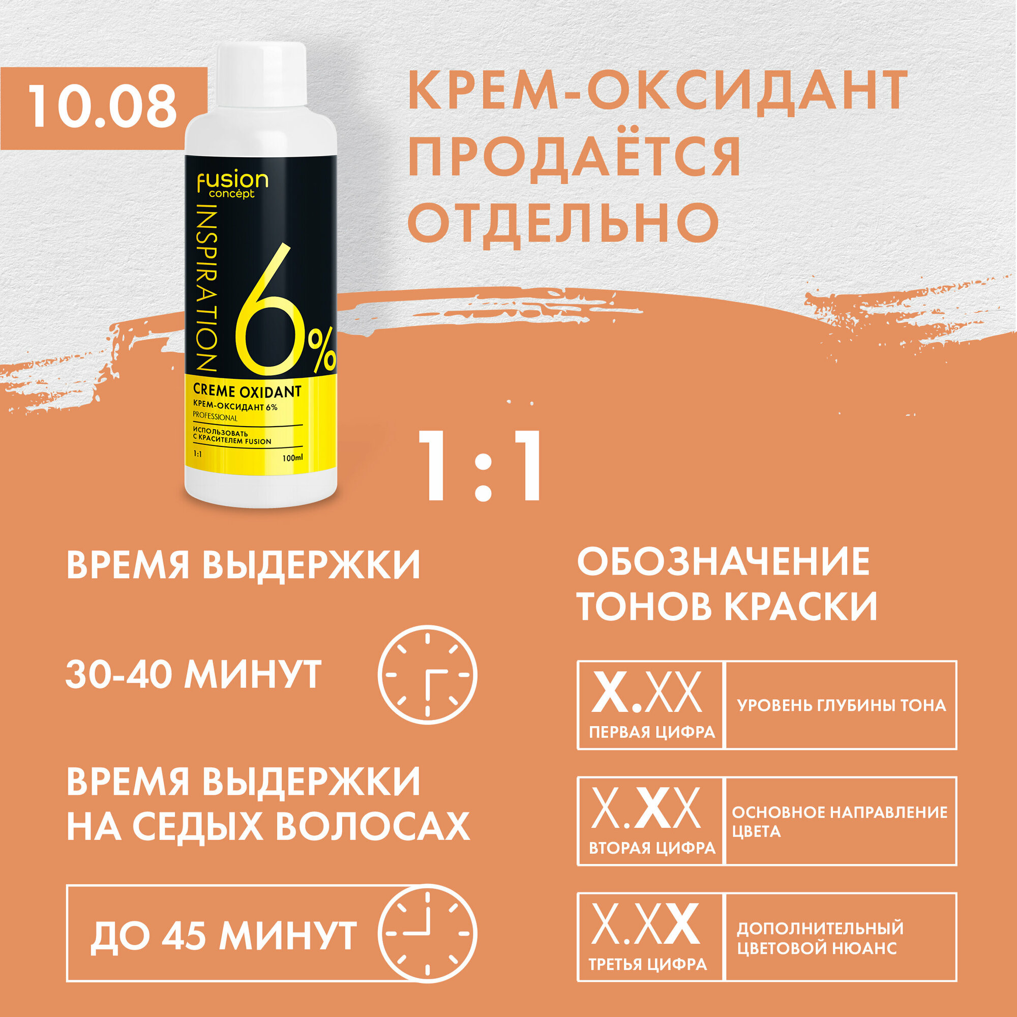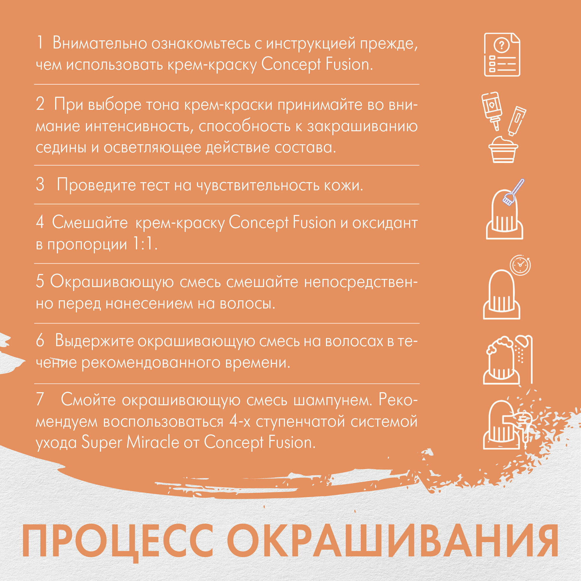 | Способ применения | Внимательно ознакомьтесь с инструкцией, прежде, чем использовать крем-краску Concept Fusion. При выборе тона крем-краски принимайте во внимание интенсивность, способность к закрашиванию седины и осветляющее действие состава. Проведите тест на чувствительность кожи. Смешайте крем-краску Concept Fusion и оксидант в пропорции 1:1. Окрашивающую смесь смешайте непосредственно перед нанесением на волосы. Выдержите окрашивающую смесь на волосах в течение рекомендованного времени. Смойте окрашивающую смесь шампунем. Рекомендуем воспользоваться 4-х ступенчатой системой ухода Super Miracle от Concept Fusion. |