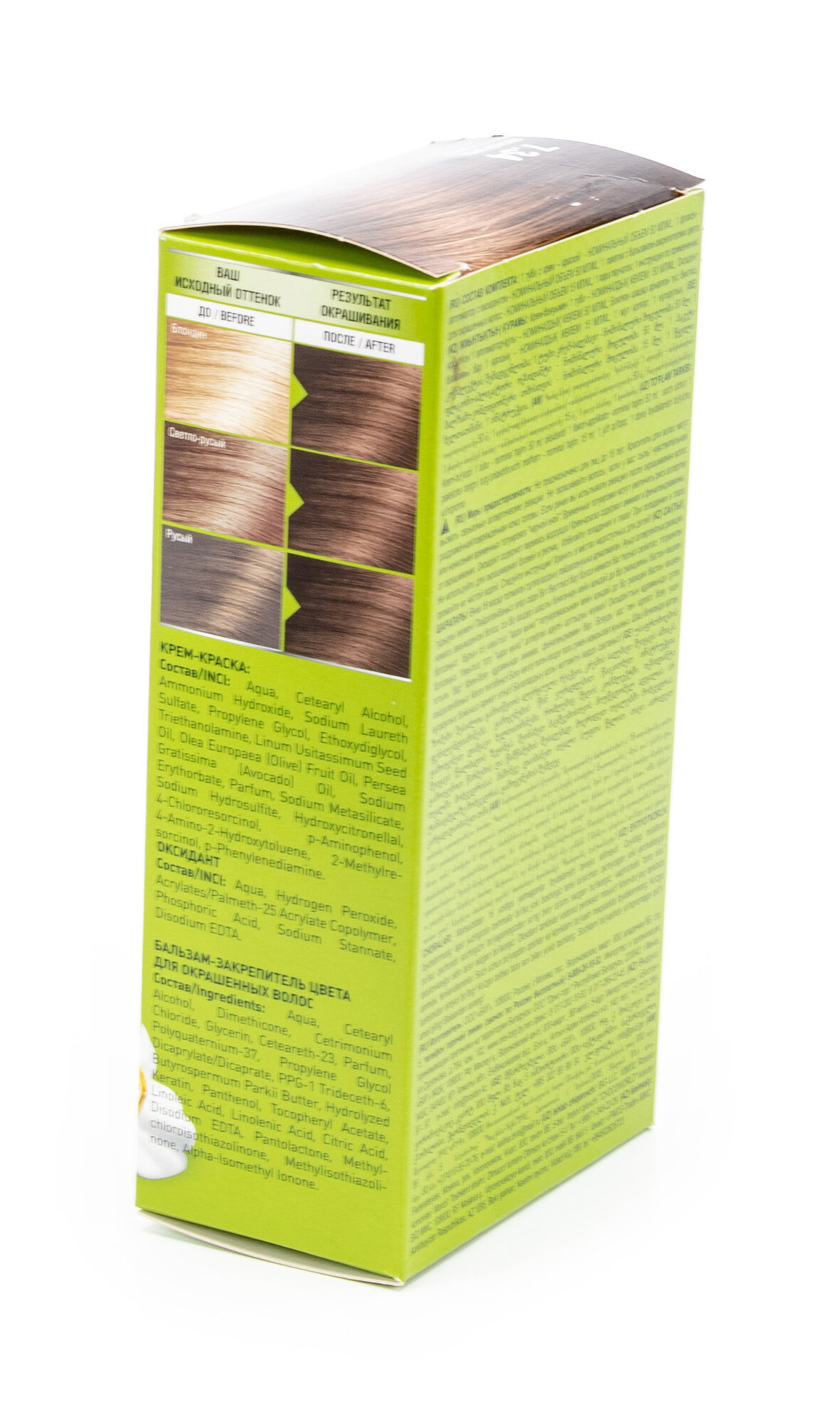 | Способ применения | перед применением проведите тест на аллергическую реакцию. Не обязательно мыть волосы перед окрашиванием. Рекомендуется выдержать 2 недели ДО или ПОСЛЕ химической завивки. Не рекомендуется использовать краску на волосах, окрашенных хной. Приготовьте смесь по инструкции. Нанесите смесь на сухие или слегка влажные волосы. Нанесите прядь за прядью на корни волос, начиная от затылка. Прежде всего следует наносить на участки с сединой С помощью редкой расчески равномерно распределите смесь по всей длине волос. Оставьте на 40 минут. Для окрашивания седых волос время следует увеличить на 10-15 минут, для осветленных волос время воздействия необходимо уменьшить на 10-15 минут Тщательно промойте волосы теплой водой |
