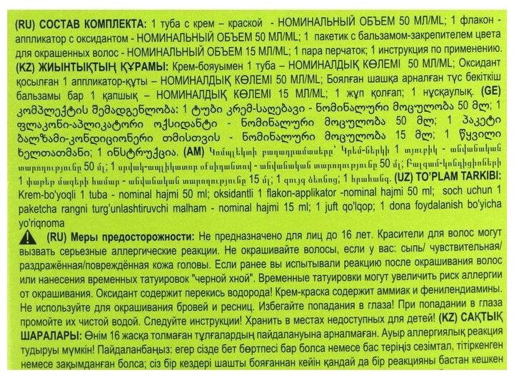 | Способ применения | перед применением проведите тест на аллергическую реакцию. Не обязательно мыть волосы перед окрашиванием. Рекомендуется выдержать 2 недели ДО или ПОСЛЕ химической завивки. Не рекомендуется использовать краску на волосах, окрашенных хной. Приготовьте смесь по инструкции. Нанесите смесь на сухие или слегка влажные волосы. Нанесите прядь за прядью на корни волос, начиная от затылка. Прежде всего следует наносить на участки с сединой С помощью редкой расчески равномерно распределите смесь по всей длине волос. Оставьте на 40 минут. Для окрашивания седых волос время следует увеличить на 10-15 минут, для осветленных волос время воздействия необходимо уменьшить на 10-15 минут Тщательно промойте волосы теплой водой |