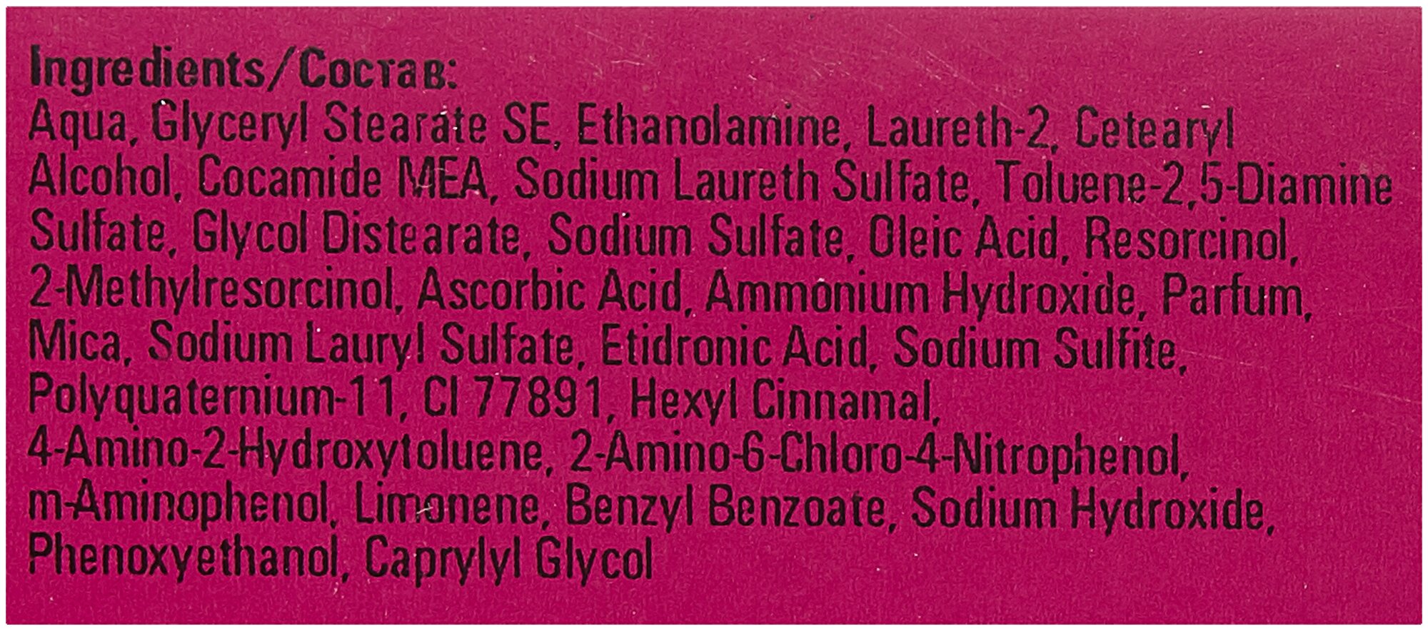 | Состав | aqua, cetearyl alcohol, ethanolamine, laureth-3, sodium laureth sulfate, toluene-2,5 diamine sulfate, glyceryl stearate se, sodium sulfate, decyltetradecanol, sodium lauryl sulfate, cera alba, parfum, sodium cocoyl isethionate, mica, hydroxyethyl-3,4-methylenedioxyaniline hci, resorcinol, sodium sulfate, m-aminophenol, ascorbic acid, hydrolyzed keratin, disidium edta, 2-methylresorcinol, ci 77891, hexyl cinnamal, limonene, benzyl benzoate |