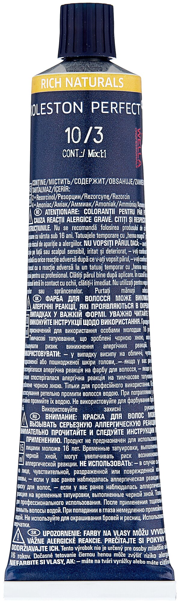 | Способ применения | приготовление смеси: смешайте краску с окислителем Welloxon Perfect в пропорции 1:1; окрашивание всех волос: намочите волосы; распределите краску на волосах и равномерно прочешите. Время выдержки с теплом 15 минут; без тепла 20 минут; окрашивание отросших корней: нанесите красящую смесь только на прикорневую часть; с теплом на 15 минут, без тепла 20 минут.осветление: нанести красящую смесь только по длине волос и концы; с теплом 10 минут, без тепла 20 минут; или нанести на прикорневую часть; с теплом 15-25 минут, без тепла 30-40 минут;по истечении времени тщательно смойте остатки краски водой, применяя шампунь Wella для окрашенных волос |