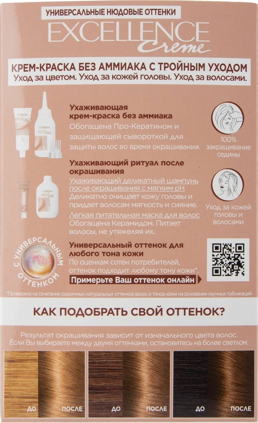 Крем-краска для волос L'oreal Excellence Creme Nudes, тон: 3U Универсальный темно-каштановый, 192 мл