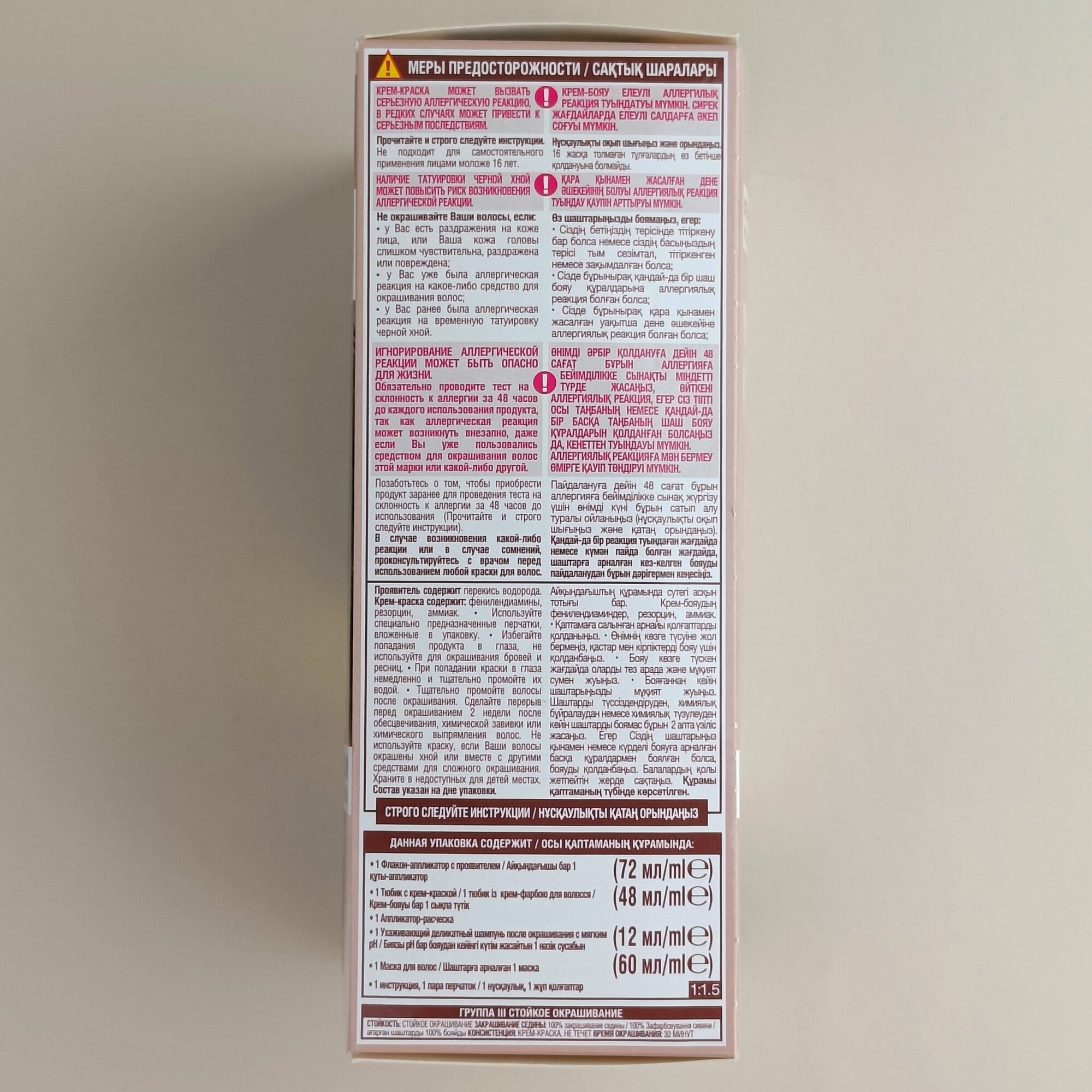 | Дополнительная информация | 1 флакон-аппликатор с проявителем - 72 мл; 1 тюбик с крем-краской - 48 мл; 1 аппликатор-расческа; 1 ухаживающий деликатный шампунь после окрашивания с мягким pH - 12 мл; 1 маска для волос - 60 мл; 1 инструкция, 1 пара перчаток |