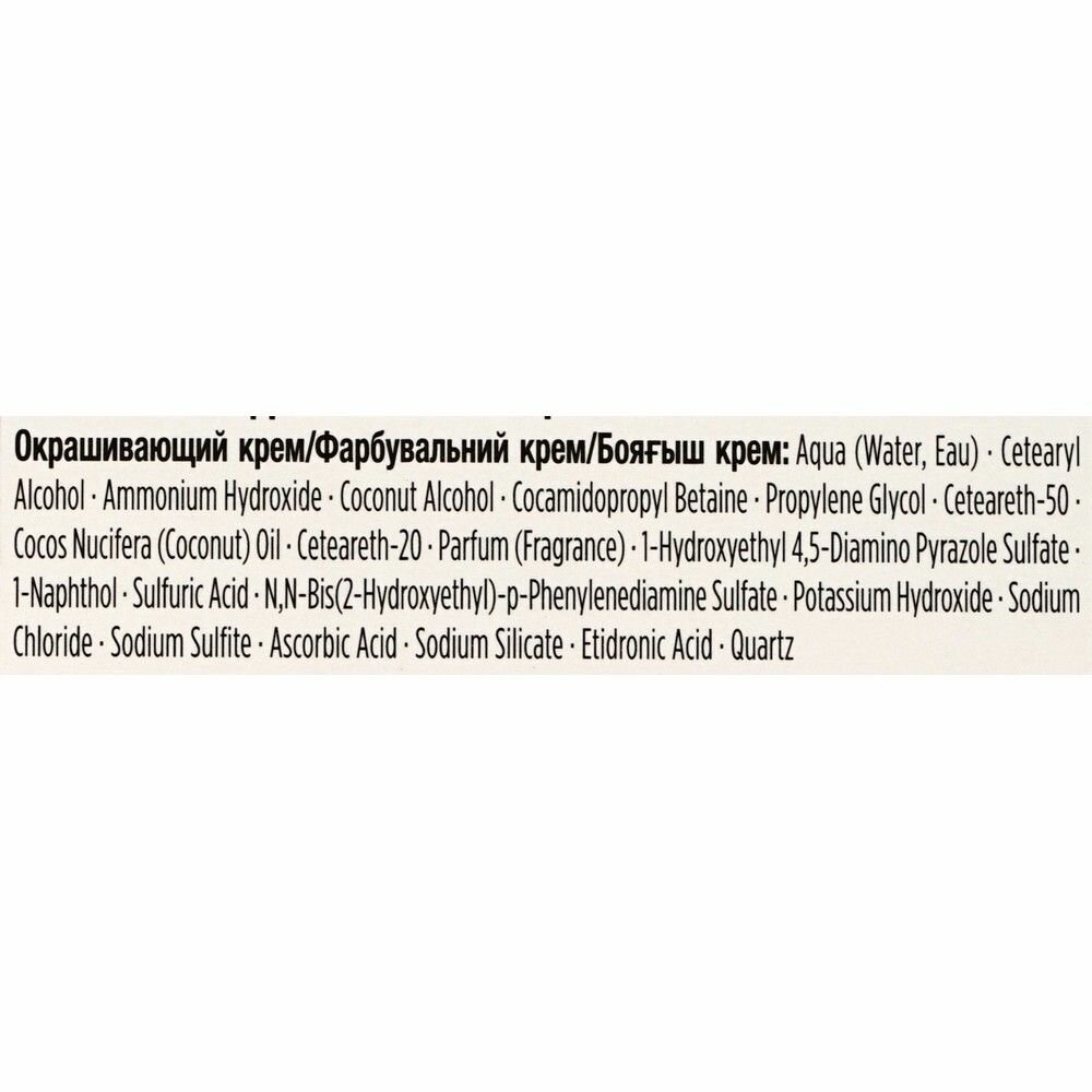| Способ применения | провести тест на аллергическую реакцию за 48 часов до каждого окрашивания. Смешать окрашивающий крем с проявляющей эмульсией. Нанесение на всю длину волос: нанести всю приготовленную смесь равномерно от корней до кончиков волос. Затем вмассировать ее в волосы кончиками пальцев. Оставить смесь для воздействия на 30 минут. Нанесение на отросшие корни: провести пробор с помощью наконечника флакона-аппликатора. Нанести окрашивающую смесь на отросшие корни. Распределить смесь кончиками пальцев, чтобы покрыть равномерно отросшие корни. Оставить окрашивающую смесь для воздействия на 20-30 минут. Нанести остатки смеси по всей длине волос с середины до кончиков и оставить для воздействия еще на 5-10 минут. По окончании времени воздействия промыть волосы теплой водой, пройтись массирующими движениями по линии волос, чтобы избавиться от следов краски. Необходимо тщательно промыть волосы до тех пор, пока вода не станет прозрачной. Нанести ухаживающий кондиционер на подсушенные полотенцем волосы и смыть через 2 минуты |
