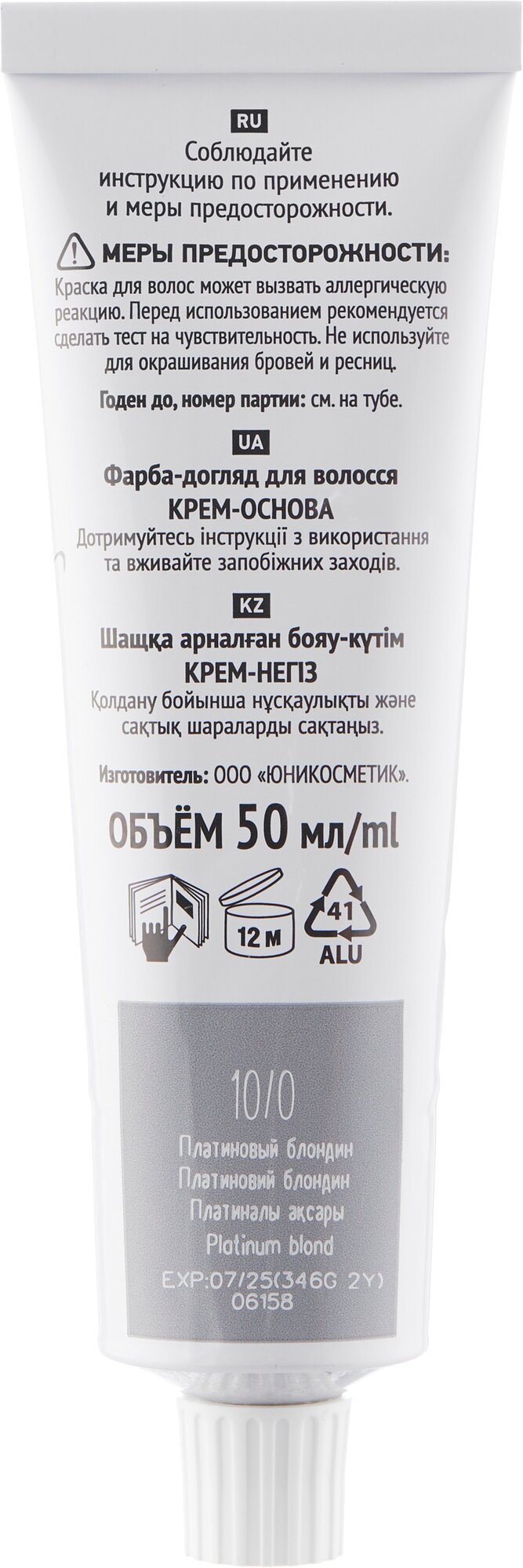 | Способ применения | приготовление смеси: тщательно смешайте в неметаллической посуде крем-основу с оксигентом до получения однородной смеси. Приготовленную смесь необходимо использовать за один раз. Первичное окрашивание: с помощью кисточки быстро нанесите смесь на сухие волосы по всей длине, разделяя их на пряди. Волосы надо лбом и на висках обработайте дважды. В завершение распределите расческой окрашивающую смесь по всей длине волос. Оставьте смесь на 20-25 минут. Окрашивание отросшей прикорневой части волос (вторичное окрашивание): нанесите приготовленную смесь на отросшие участки волос. Оставьте смесь на 10-15 минут. Затем распределите оставшуюся в мисочке смесь по всей длине волос, расчешите их и оставьте ещё на 5-10 минут. Заключительная обработка: тщательно промойте волосы большим количеством теплой воды, пока она не станет прозрачной. Рекомендуется после окрашивания вымыть волосы мягким шампунем |