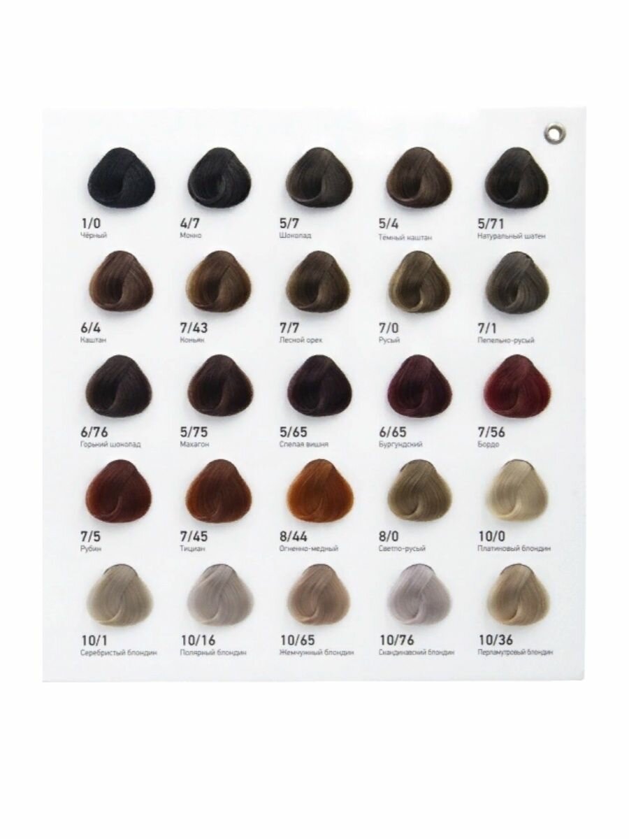 | Цвет товара | 1/0 черный, 10/0 платиновый блондин, 10/1 серебристый блондин, 10/16 полярный блондин, 10/36 перламутровый блондин, 10/65 блондин жемчужный, 10/65 жемчужный блондин, 10/76 скандинавский блондин, 4/7 мокко, 5/4 темный каштан, 5/65 спелая вишня, 5/7 шоколад, 5/71 натуральный шатен, 5/75 махагон, 6/4 каштан, 6/65 бургундский, 6/76 горький шоколад, 7-0 русый, 7/0 русый, 7/1 пепельно-русый, 7/43 коньяк, 7/45 тициан, 7/5 рубин, 7/56 бордо, 7/7 лесной орех, 8/0 светло-русый, 8/44 огненно-медный |