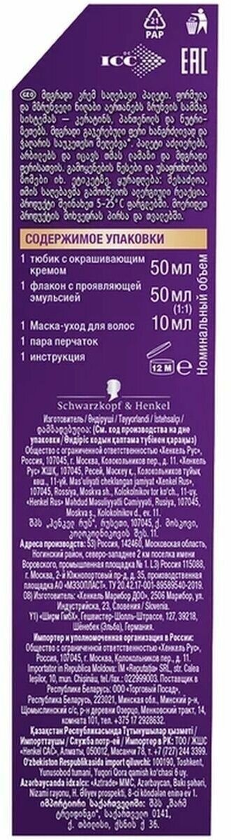 | Дополнительная информация | краски для волос могу вызывать серьезные аллергические реакции; проведите тест на аллергическую реакцию; продукт не предназначен для лиц младше 16 лет; содержит перекись водорода; избегать попадания в глаза |