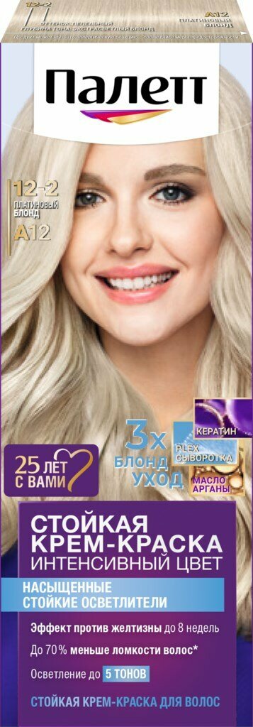 Палетт Стойкая крем-краска Интенсивный цвет, Осветлители, A12 12-2 Платиновый блонд, 110 мл - 1 шт