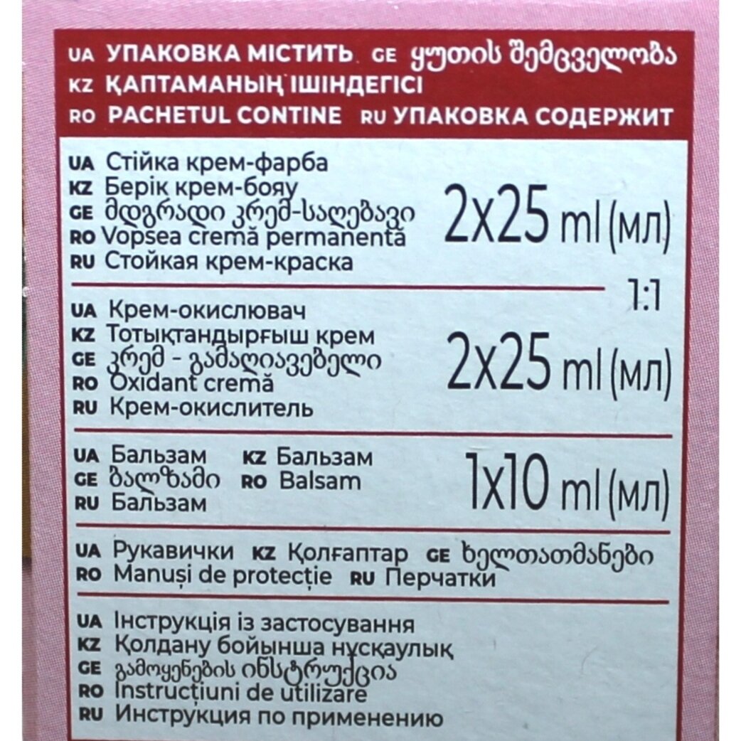 | Комплектация | Стойкая крем-краска -2 саше 25 ml (мл) Крем-окислитель - 2 саше 25 ml (мл) Бальзам - 2 саше 10 ml (мл) Перчатки Инструкция |