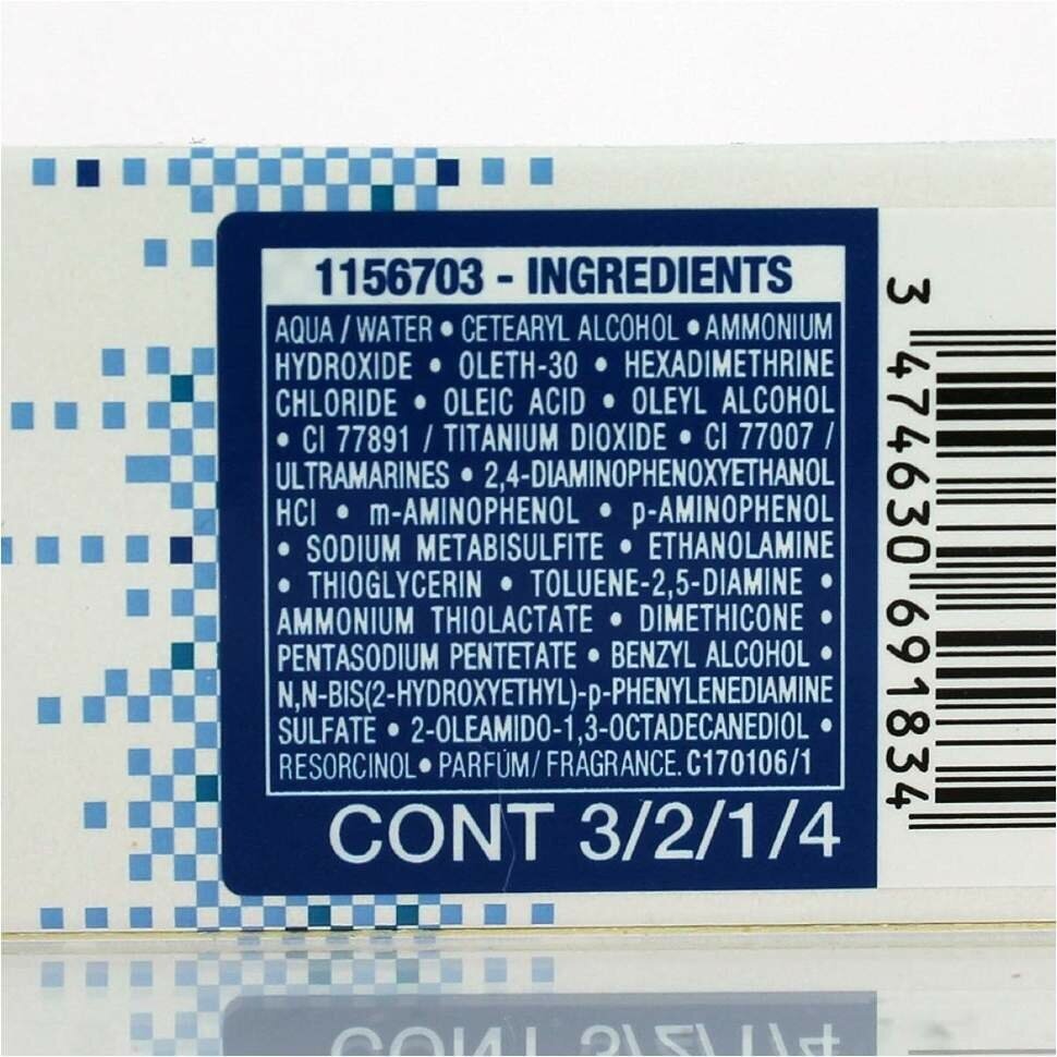 | Состав | aqua/water, cetearyl alcohol, ammonium hydroxide, oleth-30, hexadimethrine chloride, oleic acid, oleyl alcohol, ci 77891/titanium dioxide, ci 77007/ultramarines, 2,4-diaminophenoxyethanol hcl, p-aminophenol, m-aminophenol, sodium metabisulfite, ethanolamine, thioglycerin, toluene-2,5-diamine, ammonium thiolactate, dimethicone, pentasodium pentetate, benzyl alcohol, n,n-bis(2-hydroxyethyl)-p-phenylenediamine sulfate, 2-oleamido-1,3 octadecanediol, resorcinol, parfum/fragrance |