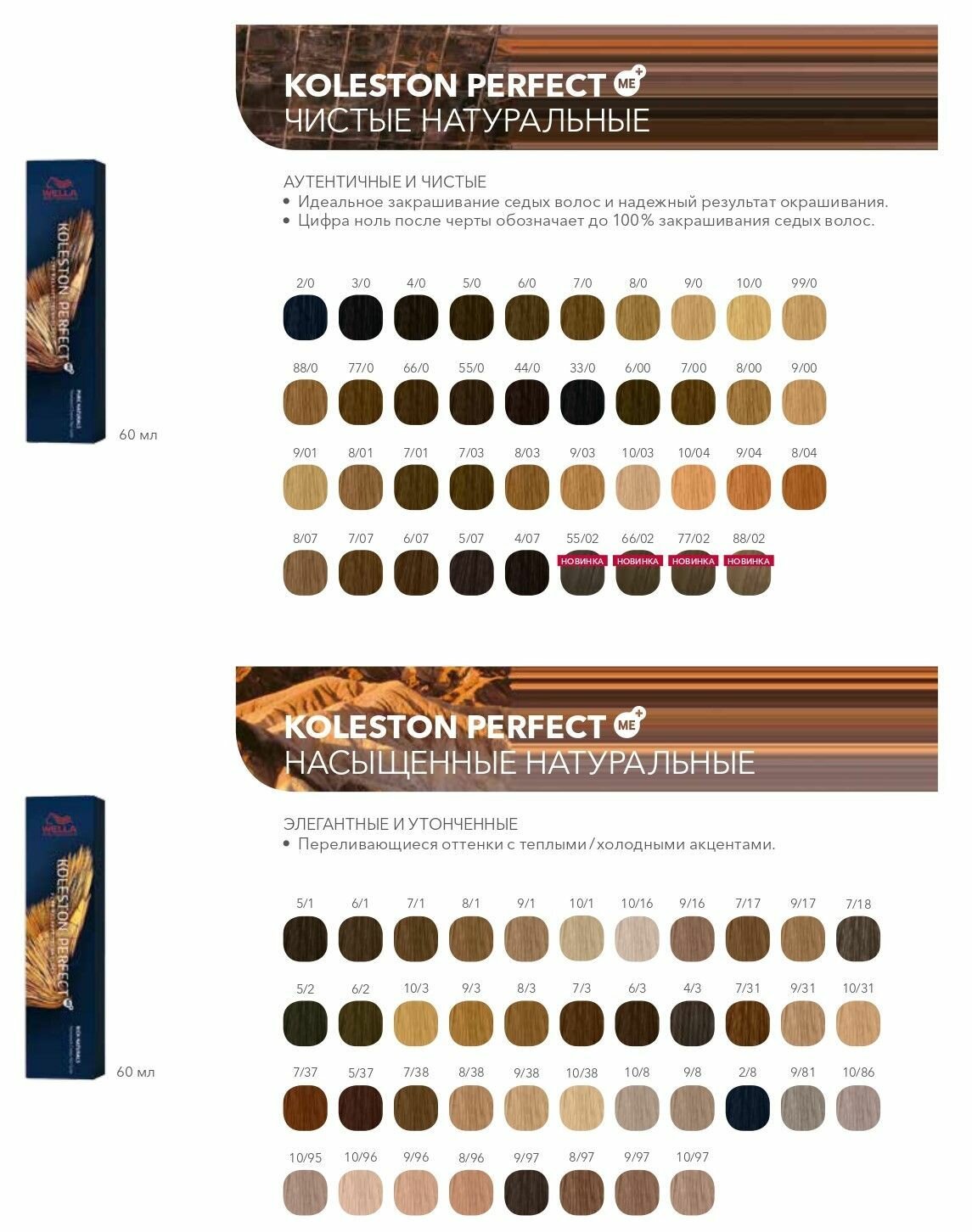 | Способ применения | подготовка к окрашиванию: не используйте шампунь перед применением; нанести смесь на корни и длину волос одновременно; для защиты рук используйте перчатки; нанесение красителя: смешайте в неметаллической емкости краситель Wella Professionals Koleston Perfect Me+ с активирующим лосьоном Welloxon Perfect; завершение окрашивания: после окончания времени воздействия тщательно промойте волосы большим количеством воды пока вода не станет прозрачной; вымойте голову шампунем, затем нанесите кондиционер; время выдержки: с теплом: 15-25 минут, без тепла: 30-40 минут; более подробная инструкция на упаковке. |
