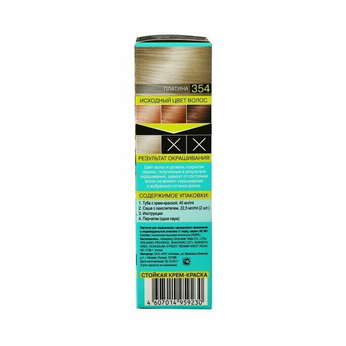 | Комплектация | туба с крем-краской 45 мл, саше с окислителем 22,5 мл, инструкция, перчатки 1 пара |