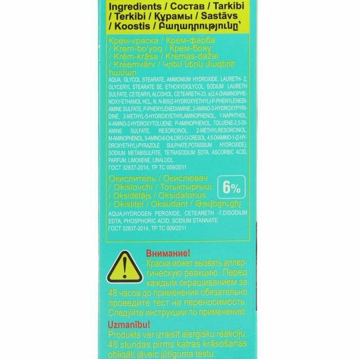 | Комплектация | туба с крем-краской 45 мл, саше с окислителем 22,5 мл, инструкция, перчатки 1 пара |