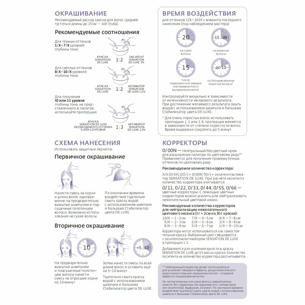| Способ применения | Рекомендуемый расход краски для волос средней густоты и длины до 15 см — 60 г (туба). Рекомендуемые соотношения Для тёмных оттенков 5/Х–7/Х уровней глубины тона: 1 часть краски SENSATION DE LUXE + 2 части 3% оксигента SENSATION DE LUXE. Для светлых оттенков 8/Х–10/Х уровней глубины тона: 1 часть краски SENSATION DE LUXE + 2 части 1,5% активатора SENSATION DE LUXE. Для получения 10 уровня глубины тона, не представленного в палитре, используйте пропорцию: 1 часть краски необходимого оттенка 9 уровня + 3 части 1,5% активатора SENSATION DE LUXE. Используйте защитные перчатки. |