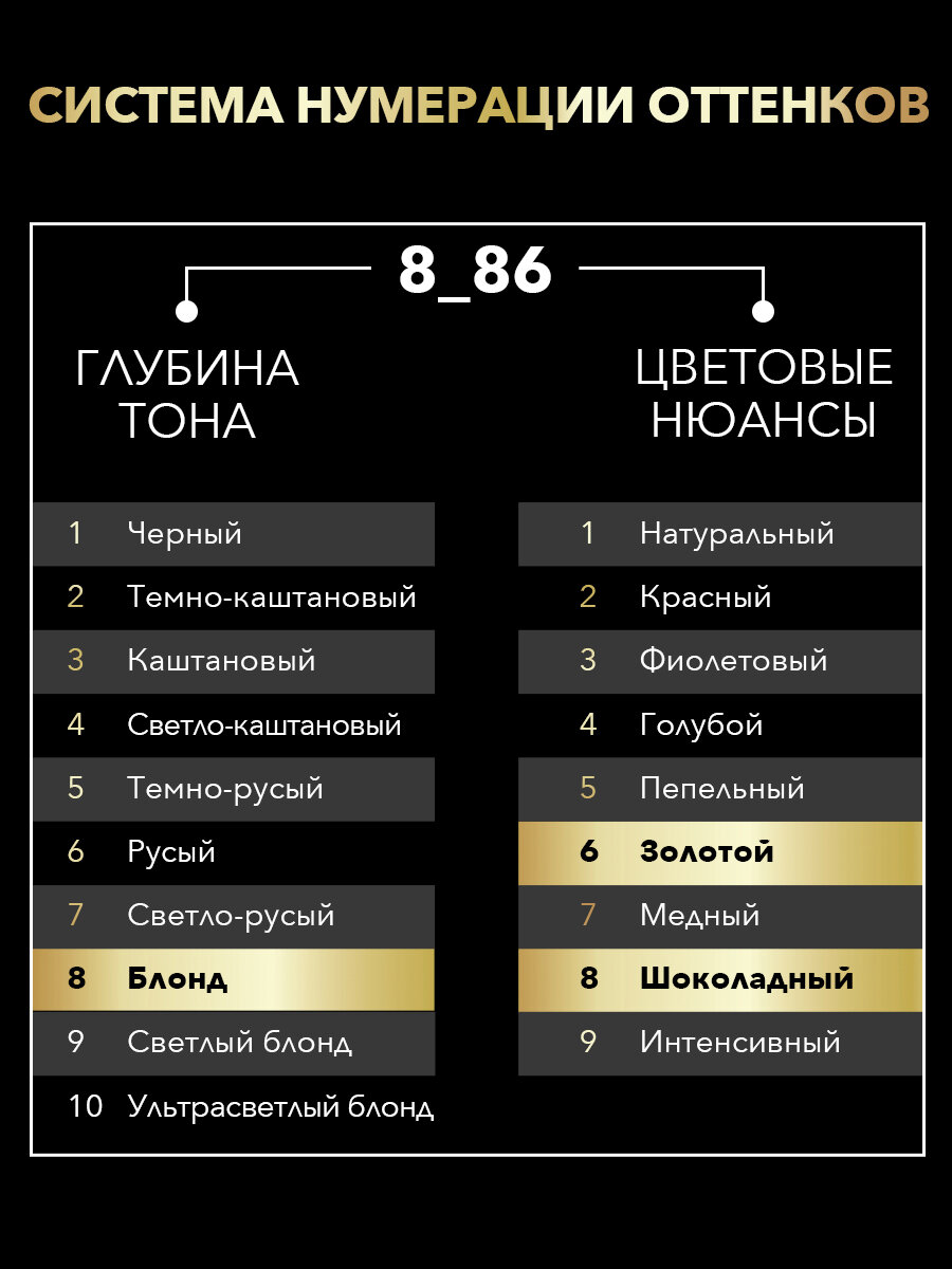 | Цвет товара | 1-10 Глубокий чёрный, 10-00 ультра-светлый блонд, 10-05 Жемчужный блонд, 10-50 Дымчатый блонд, 12-00 Платиновый блонд экстра, 2-10 чёрно-каштановый, 3-10 глубокий каштановый, 3-82 Красное дерево, 3-86 Темный Шоколад, 4-15 Ореховый каштановый, 4-18 Шоколадный каштановый, 4-50 Графитовый каштановый, 4-60 Золотистый каштановый, 5-10 натуральный каштановый, 5-28 Горячий Шоколад, 5-77 Глянцевая бронза, 5-86 Карамельный каштановый, 6-10 Тёмно-русый, 6-55 Пепельный темно-русый, 6-76 Мерцающий медный, 6-80 Золотистый русый, 7-10 Натуральный светло-русый, 7-58 Холодный русый, 7-70 Золотое манго, 8-05 Натуральный блонд, 8-50 натуральный пепельный блонд, 8-60 Медовый блонд, 8-70 Янтарный блонд, 8-86 Золотистый светло-русый, 9-10 Яркий блонд, 9-11 Холодный блонд, 9-60 Песочный блонд |