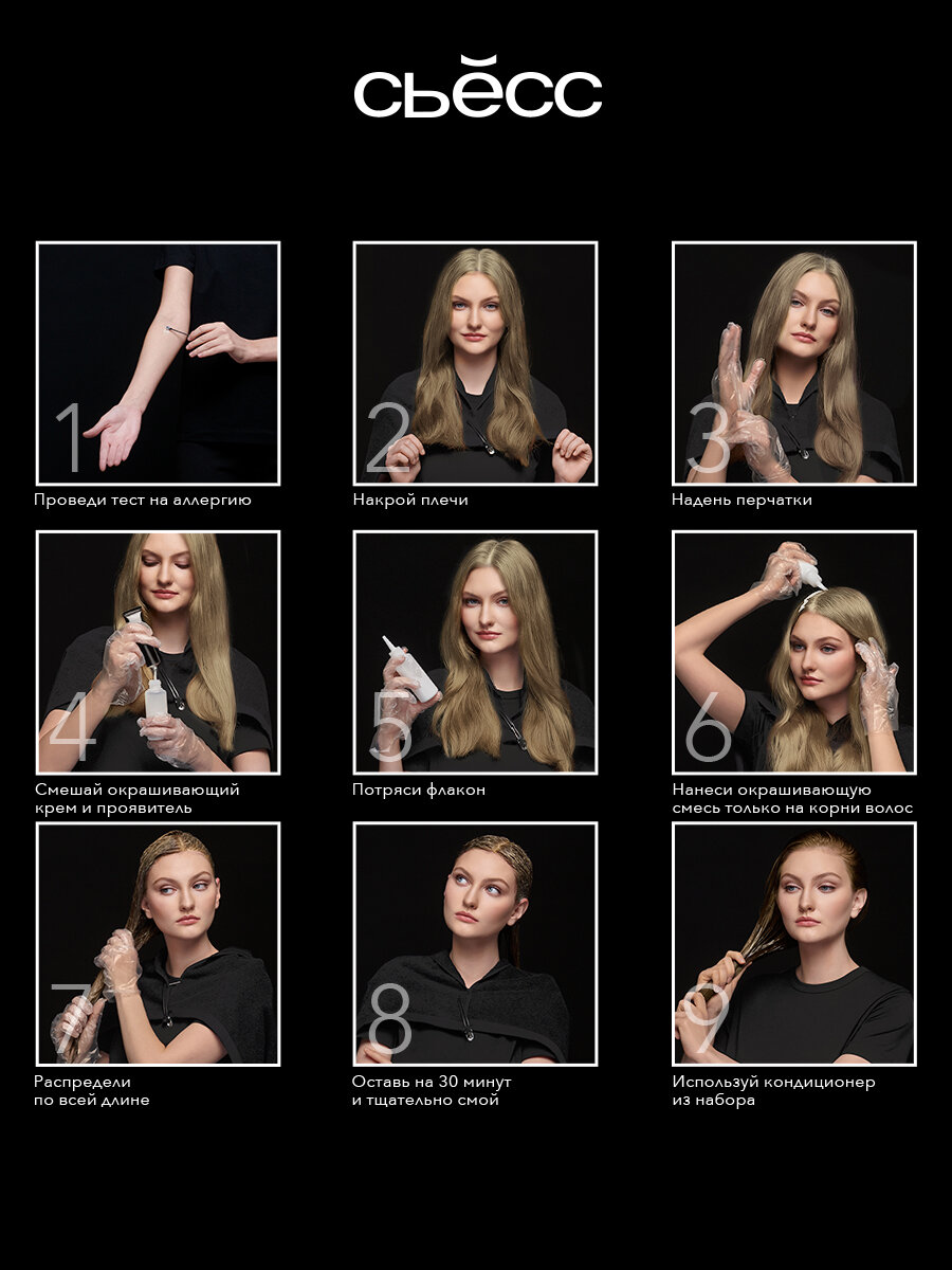 | Способ применения | перед началом окрашивания приготовьте пеньюар для защиты одежды и часы, чтобы следить за временем воздействия. Краску SYOSS следует наносить на сухие невымытые волосы. Отвинтите крышку флакона-аппликатора. Откройте тюбик с окрашивающим кремом, проткнув мембрану специальным шипом внутри крышечки. Выдавите все содержимое тюбика во флакон-аппликатор. Снова закройте флакон-аппликатор и энергично взболтайте смесь, пока все компоненты не образуют однородный по своему составу крем. В конце отвинтите колпачок наконечника флакона-аппликатора и немедленно начинайте нанесение.Наносите приготовленную смесь непосредственно из флакона-аппликатора на сухие невымытые волосы |