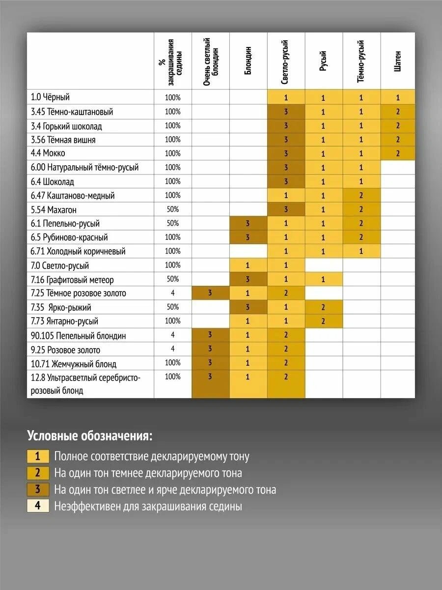 | Дополнительная информация | краситель – 50 мл, окислитель – 50 мл, бальзам – 15 мл Перед применением проведите тест на аллергическую реакцию. Не обязательно мыть волосы перед окрашиванием. Рекомендуется выдержать 2 недели до и после химической завивки. Не рекомендуется использовать краску на волосах, окрашенных хной. |