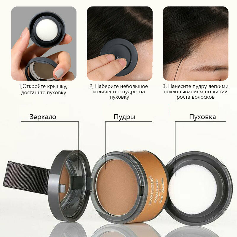 | Способ применения | Убедитесь, что ваши волосы чистые и сухие перед использованием пудры. Нанесение: Возьмите немного пудры на спонж, который идет в комплекте и находится в нижней части баночки пудры. Начните с корней волос, нанося пудру на области седины или там, где требуется добавить объем. Распределение: Равномерно распределите пудру по волосам, особенно концентрируясь на корнях и областях с сединой. Ожидание: Дайте пудре несколько минут, чтобы она проникла в волосы и закрепилась. Укладка: После того, как пудра впиталась, уложите волосы в желаемую прическу. Очистка: Чтобы удалить пудру, достаточно помыть волосы шампунем как обычно. |