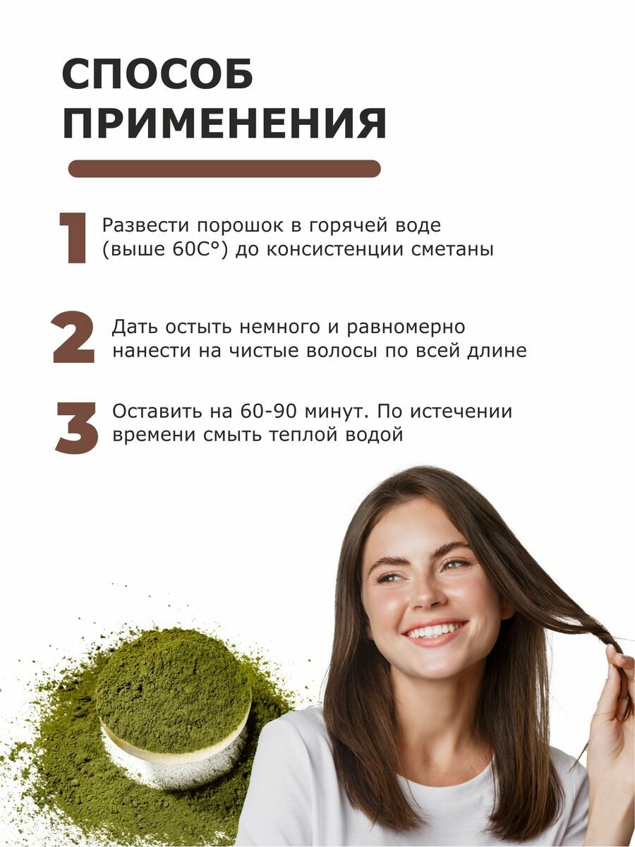 | Способ применения | Развести порошок в горячей воде (выше 60°C) до консистенции сметаны. Дать немного остыть и равномерно нанести на чистые волосы по всей длине. Оставить на 60-90 минут. По истечении времени смыть теплой водой. |