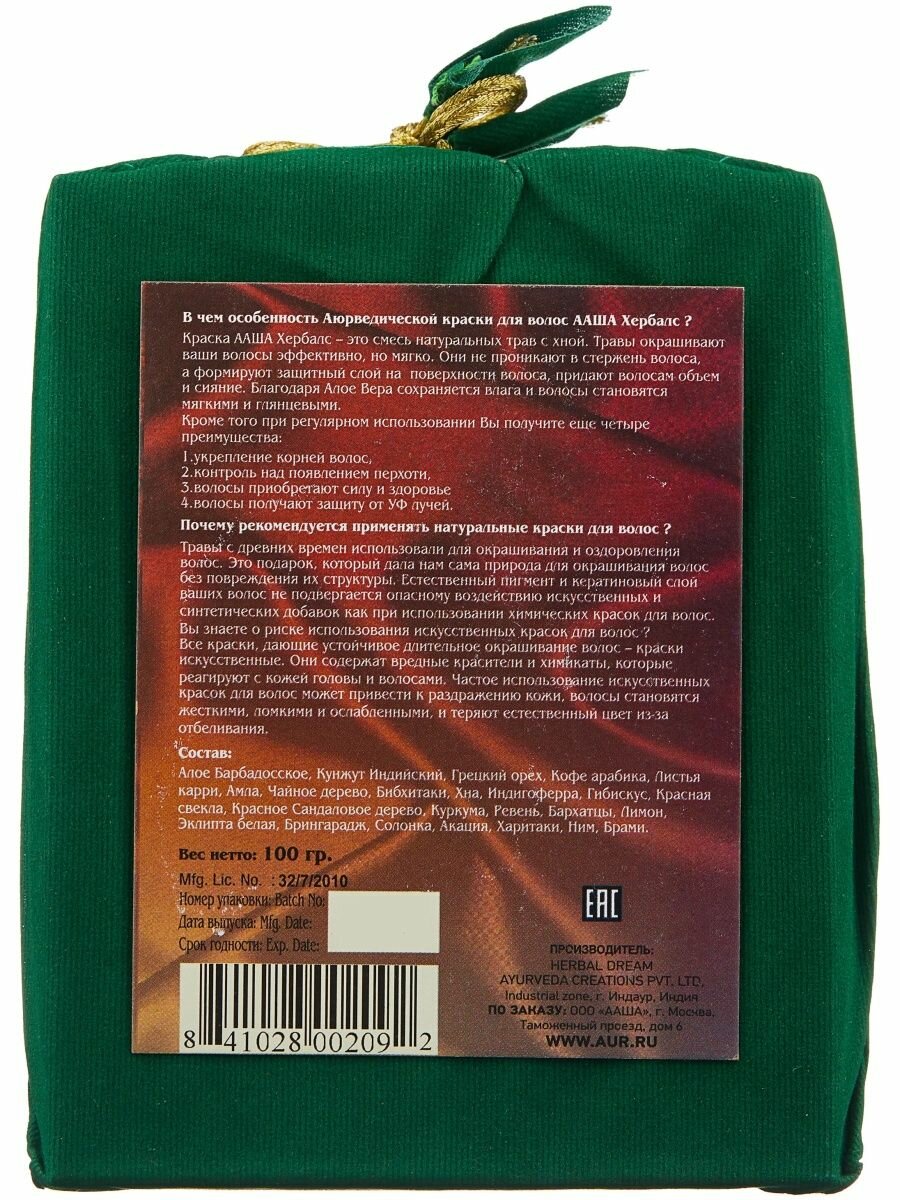 | Состав | алое барбадосское, кунжут индийский, грецкий орех, кофе арабика, листья карри, амла, чайное дерево, бибхитаки, хна, индигоферра, гибискус китайская роза, красная свекла, красное сандаловое дерево, куркума (желтый имбирь), ревень, бархатцы, лимон, эклипта белая, (брингарадж), солонка (касторовое масло), акация, харитаки, ним индийский, брами (готу кола) |