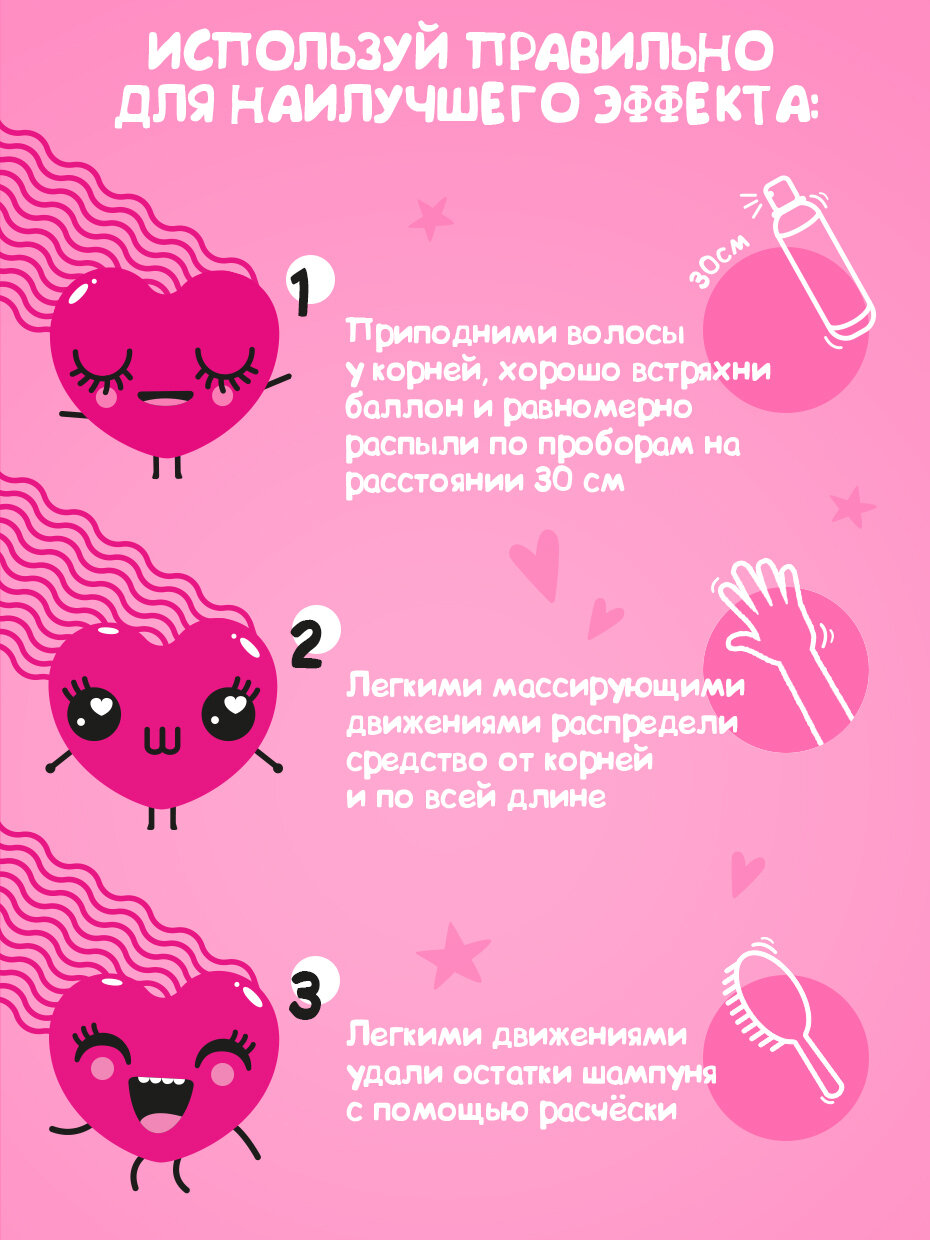 | Способ применения | Тщательно встряхни баллон и распыли средство на сухие волосы с расстояния 20-30 см, уделяя особое внимание корням. Подожди 30-60 сек., затем массирующими движениями распредели средство по волосам. Тщательно расчеши волосы расческой. |